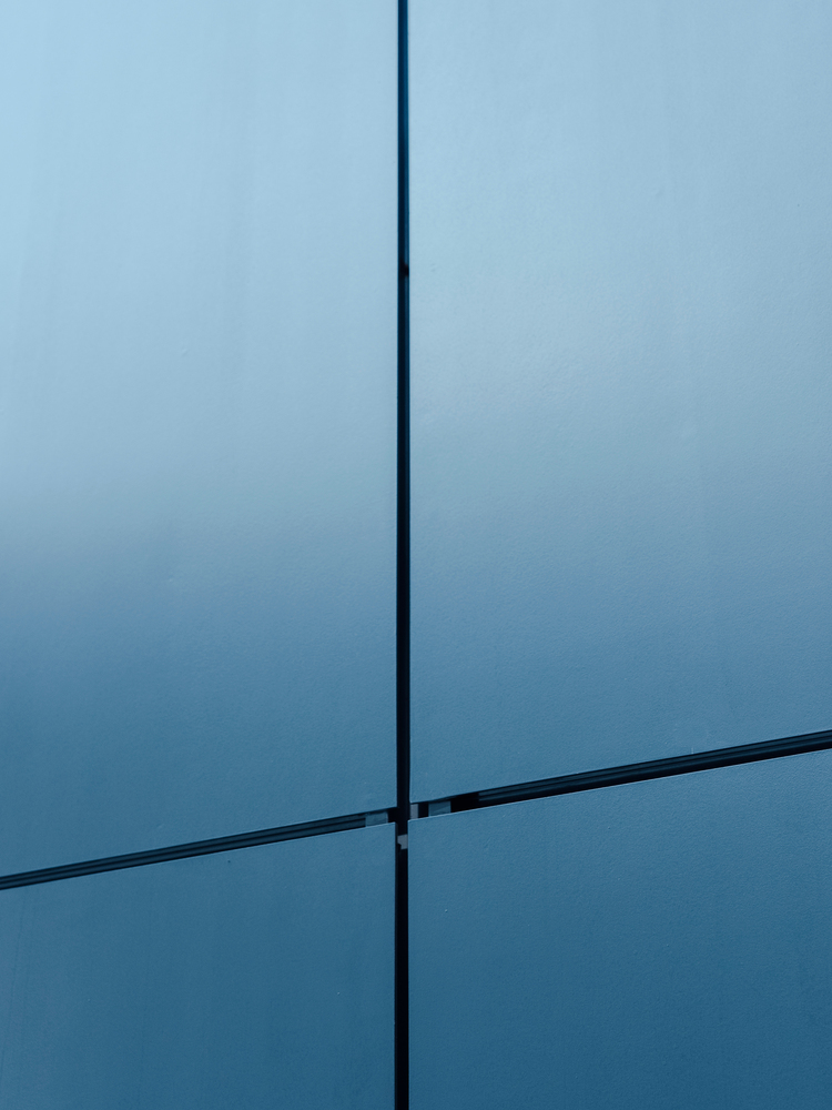 A diagonal wall inserted on the south side — marking the junction between old and new — refracts light differently throughout the day, causing the facade to shift its tone with weather and time.