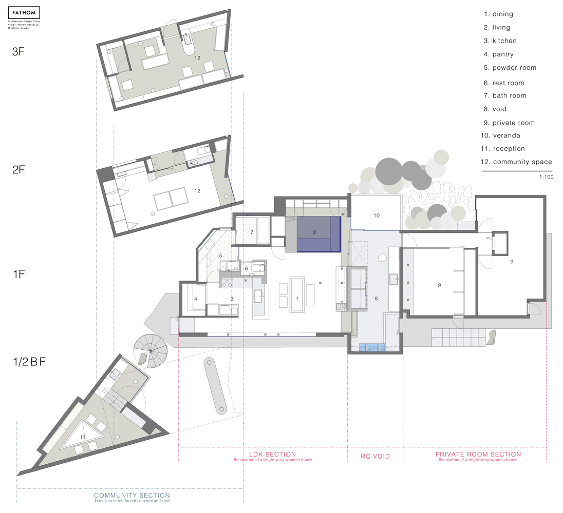 Inserted between the LDK and private wings, the RC void functions as the central hub that binds the entire residence together.