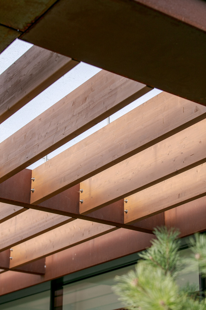 This function is fulfilled only by wild shrubs forming a natural barrier around the property. The building's façades and the edges of the driveway are clad with corten steel panels. To maintain a unified building form, the automatic garage doors were hidden behind façade panels.