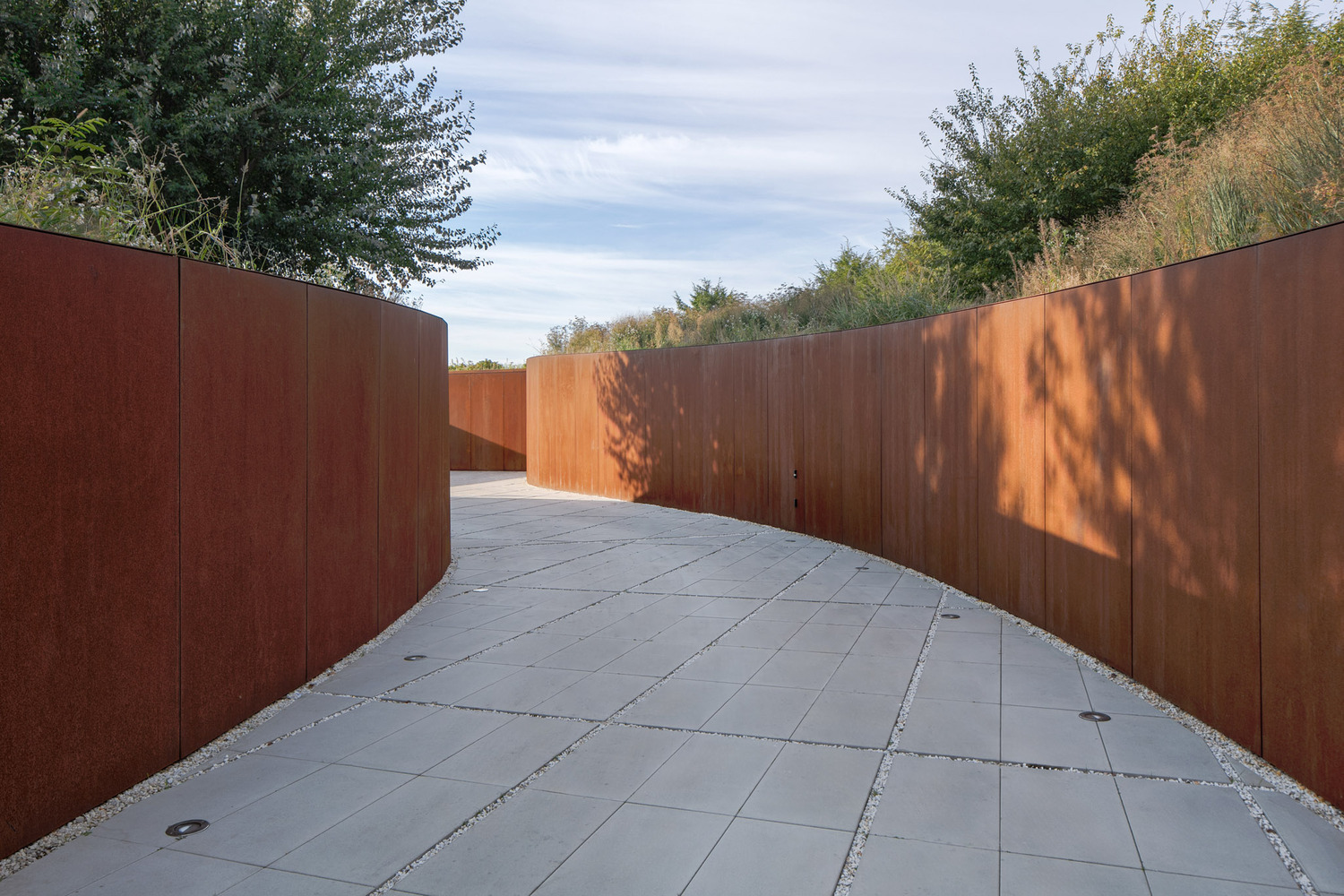 In the rising meadow, the designers "cut a rusty, steel ravine" forming the entrance and driveway to a small patio where the entrance to the house is located.