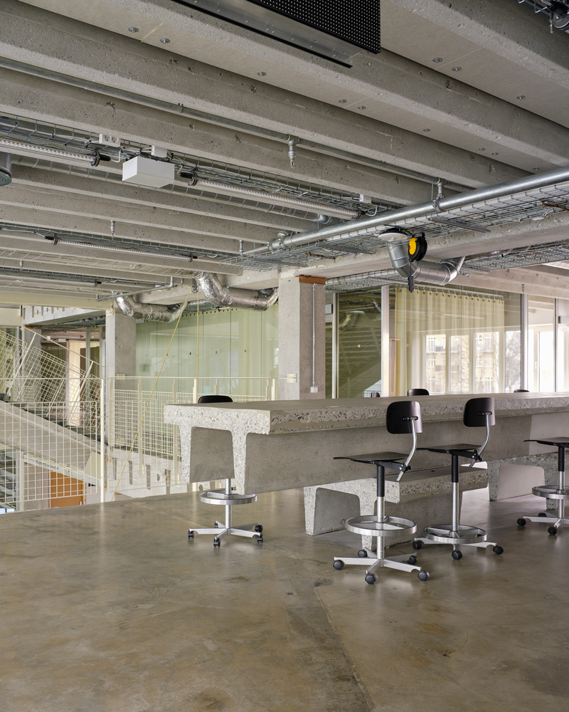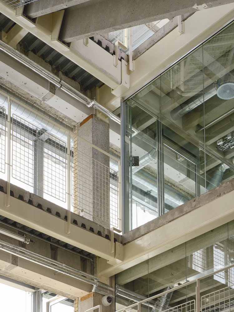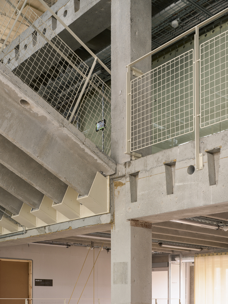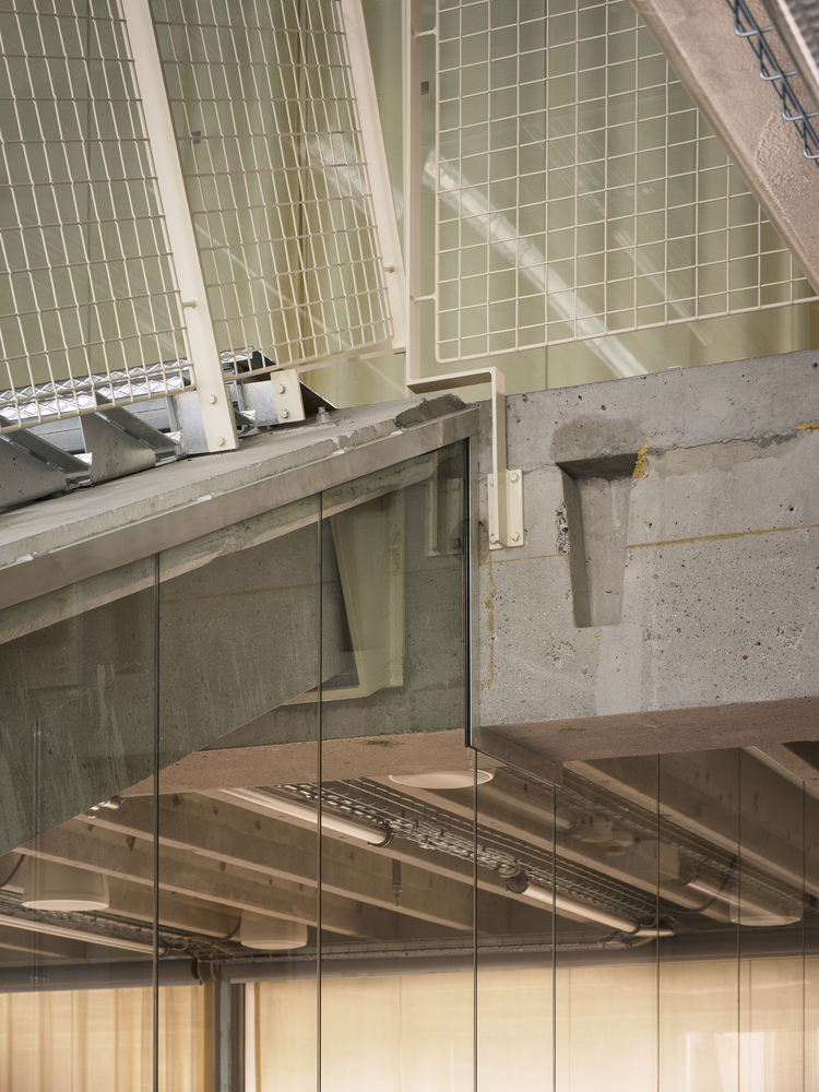 During the transformation, it was stripped down to its core: a column-beam structure with TT-slabs and facades marked by horizontal window bands. The new program required fundamental changes to the building's anatomy.