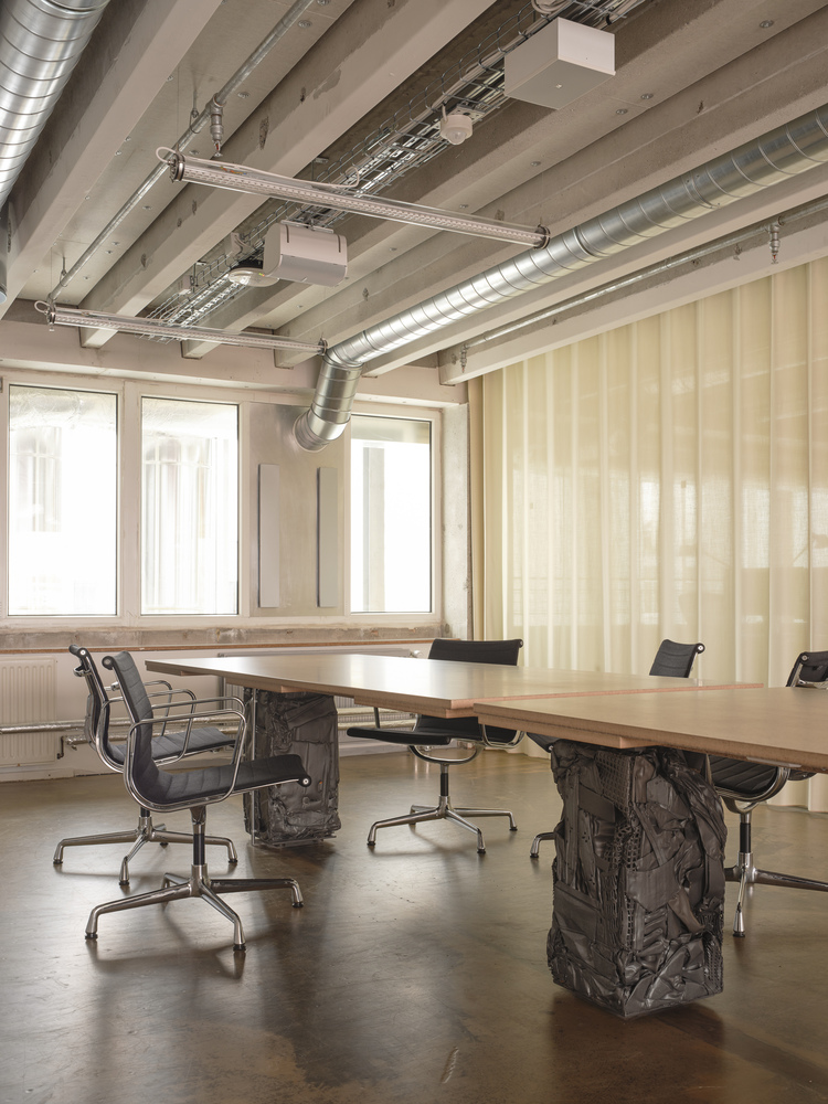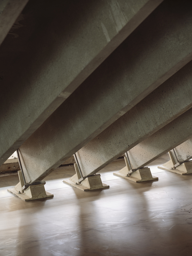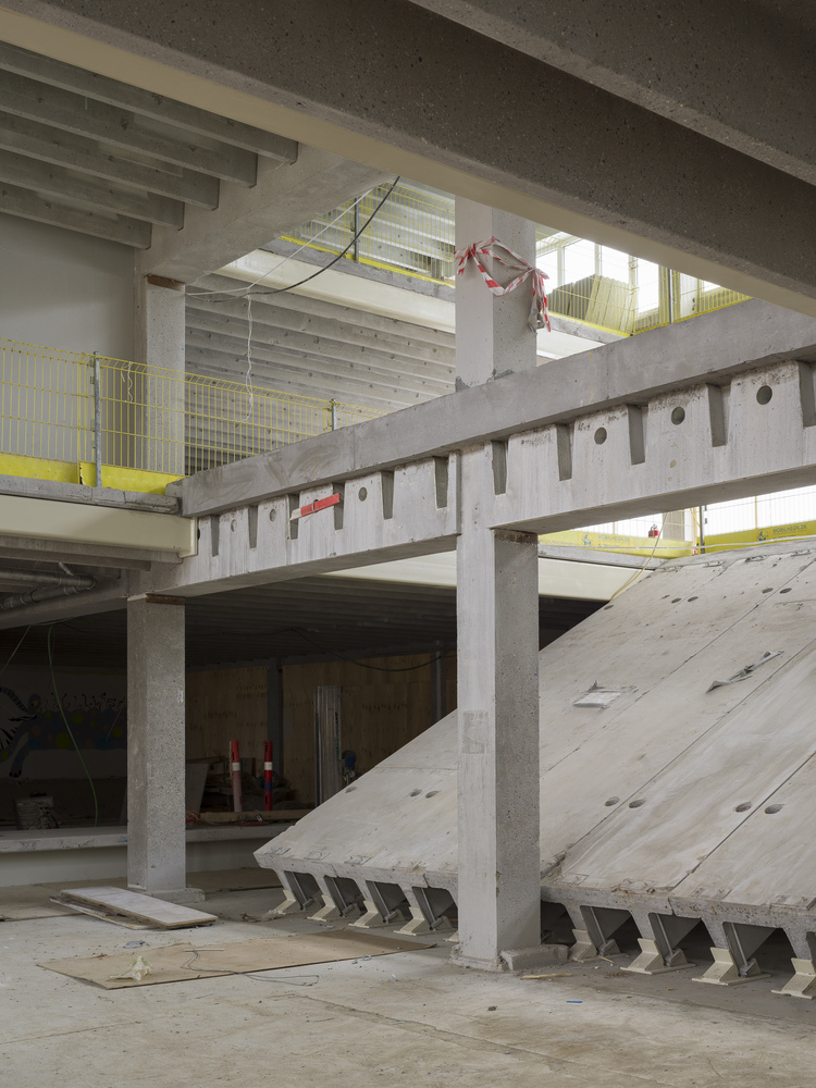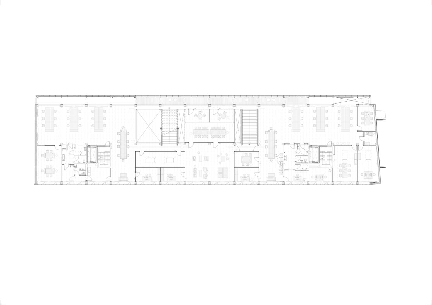 During the transformation, it was stripped down to its core: a column-beam structure with TT-slabs and facades marked by horizontal window bands. The new program required fundamental changes to the building's anatomy.