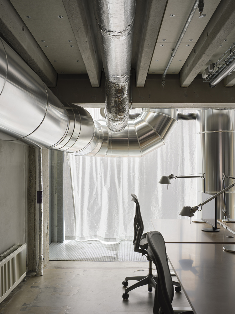 The upper levels have been preserved, maintaining the area's vanishing industrial character, while the ground floor is now connected to its surroundings.