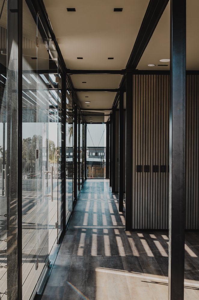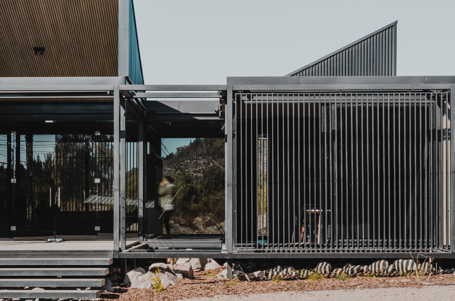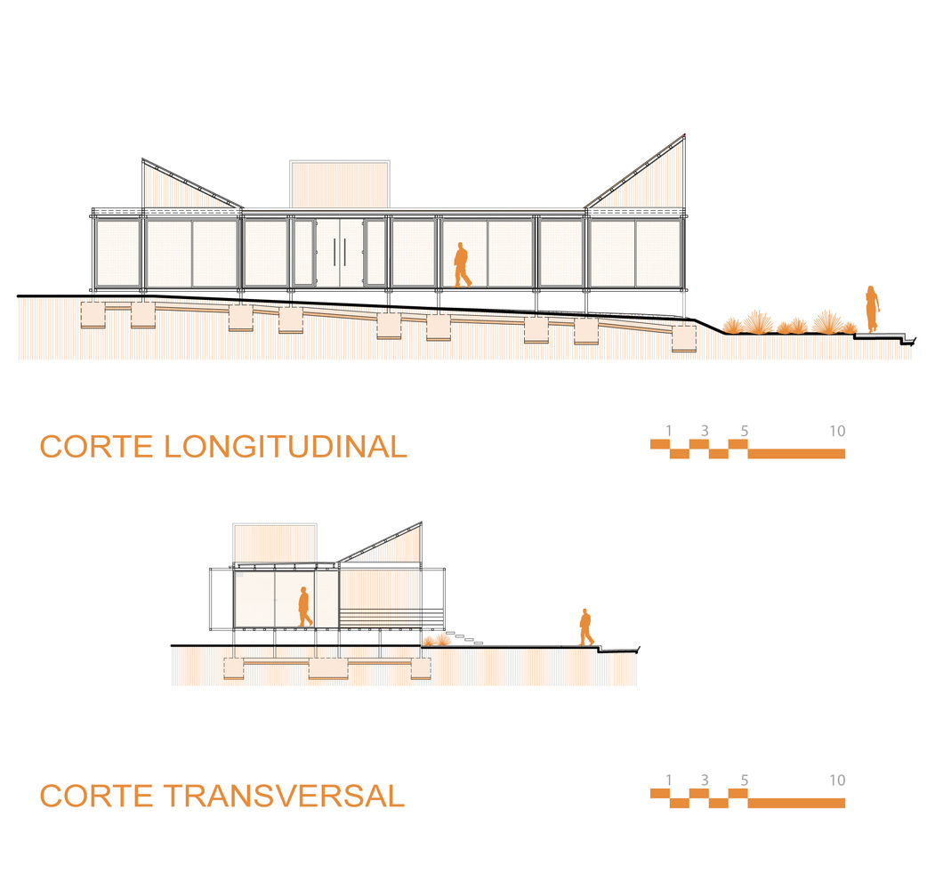 In its tectonic expression, the Visitor Center manifests a modular, lightweight, and permeable character, with a metal structure, neutral tones, vertical patterns, transparencies, and reflections.