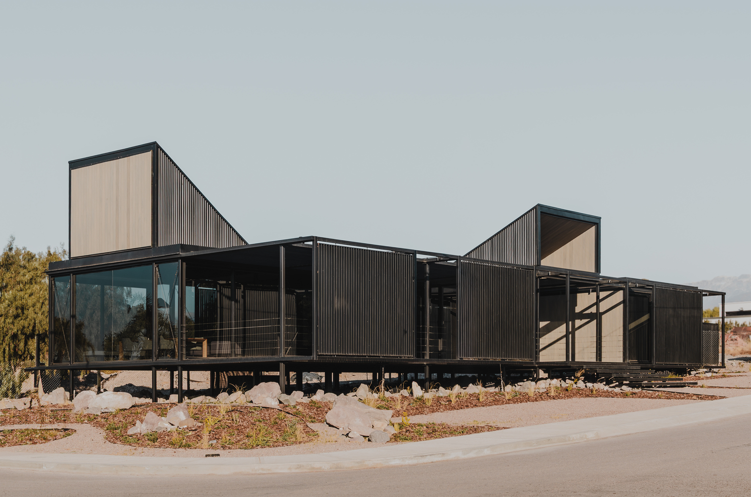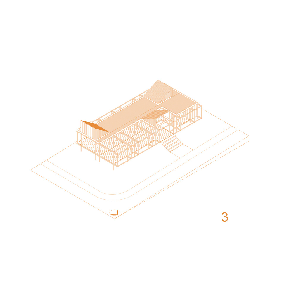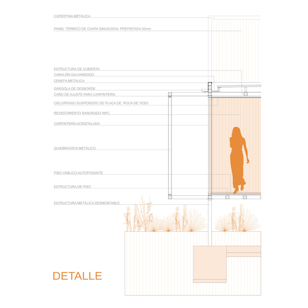 Its modular design and lightweight metal structure—chosen for its quick assembly and disassembly—allow it to rise above the natural grade, generating a defined horizontal plane between the ground and the roof.