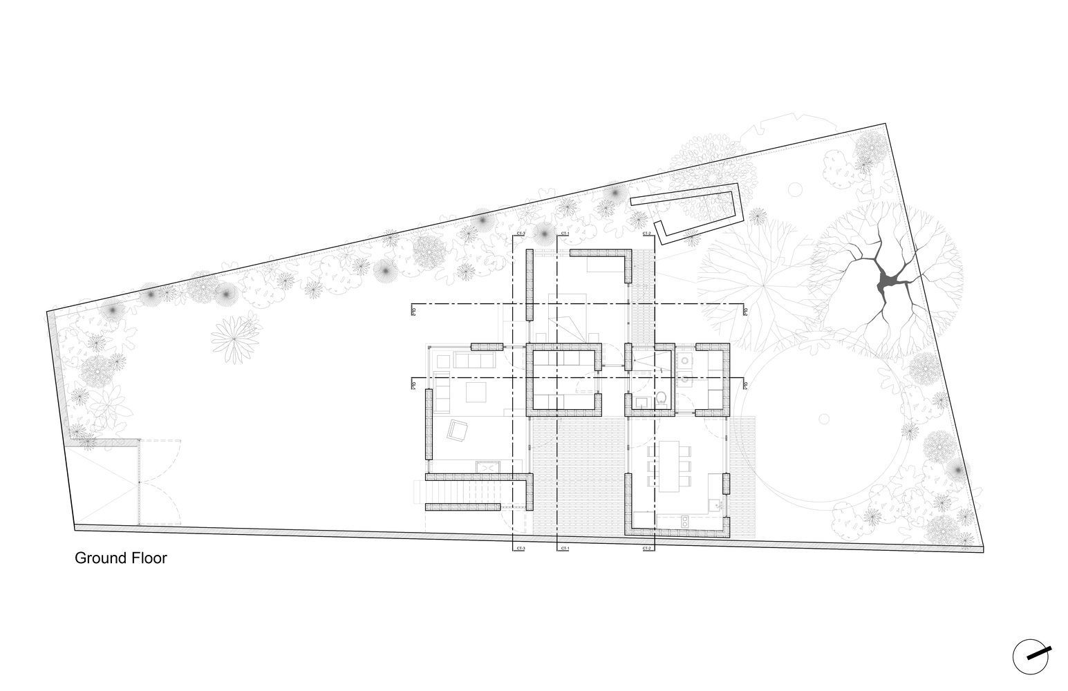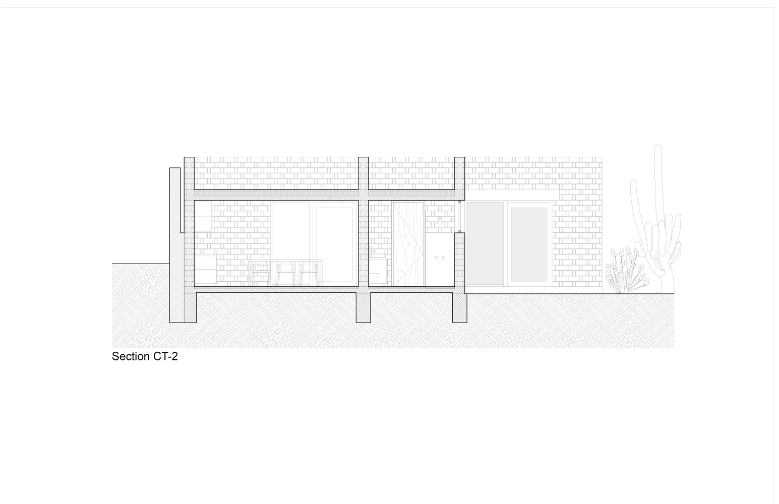 To the west, the dwelling is articulated into three staggered volumes, a gesture that negotiates the irregular trace of the cactus boundary while avoiding the remains of the mining shaft.
