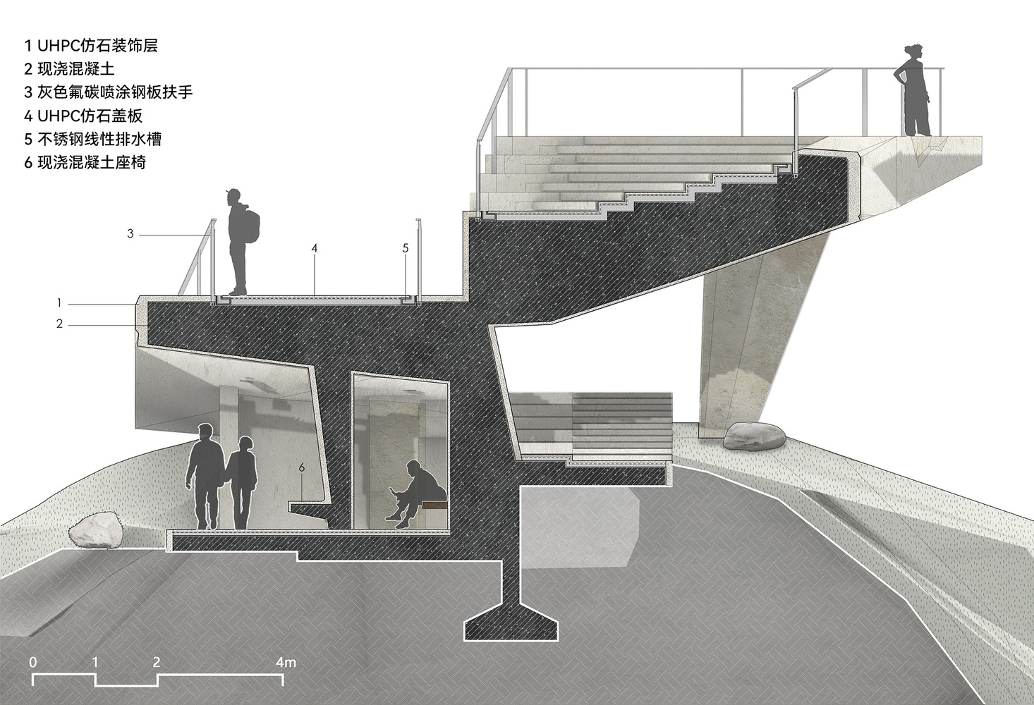 Material selection was central to the solution. Ultra-High-Performance Concrete (UHPC) was chosen for its durability, resistance to weathering, and low maintenance.