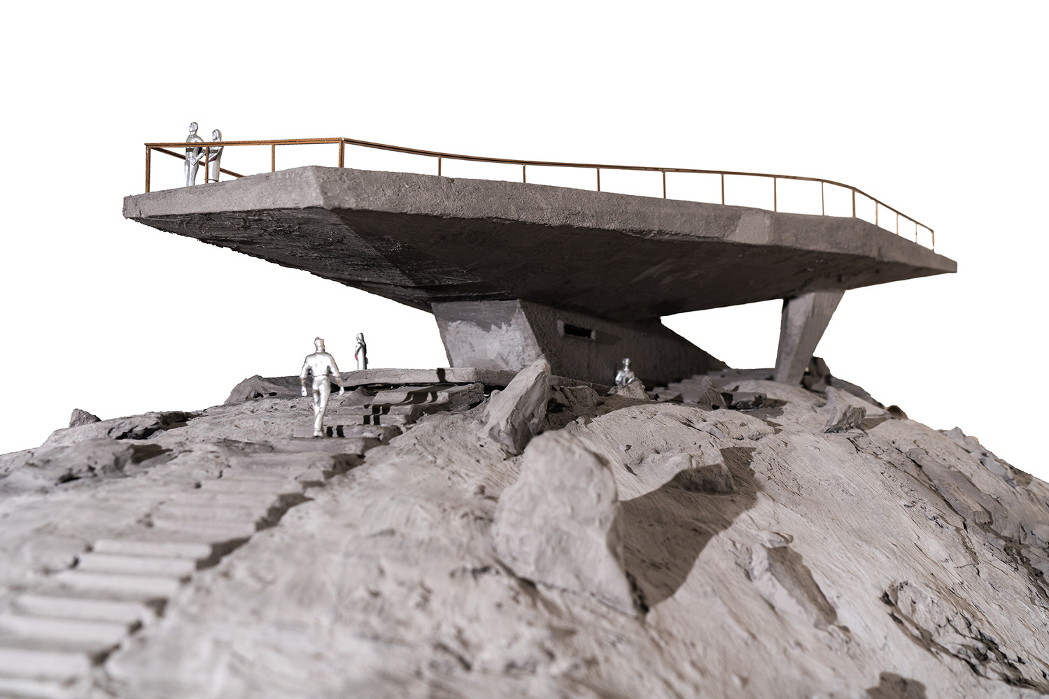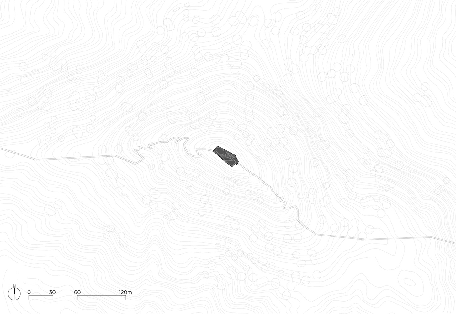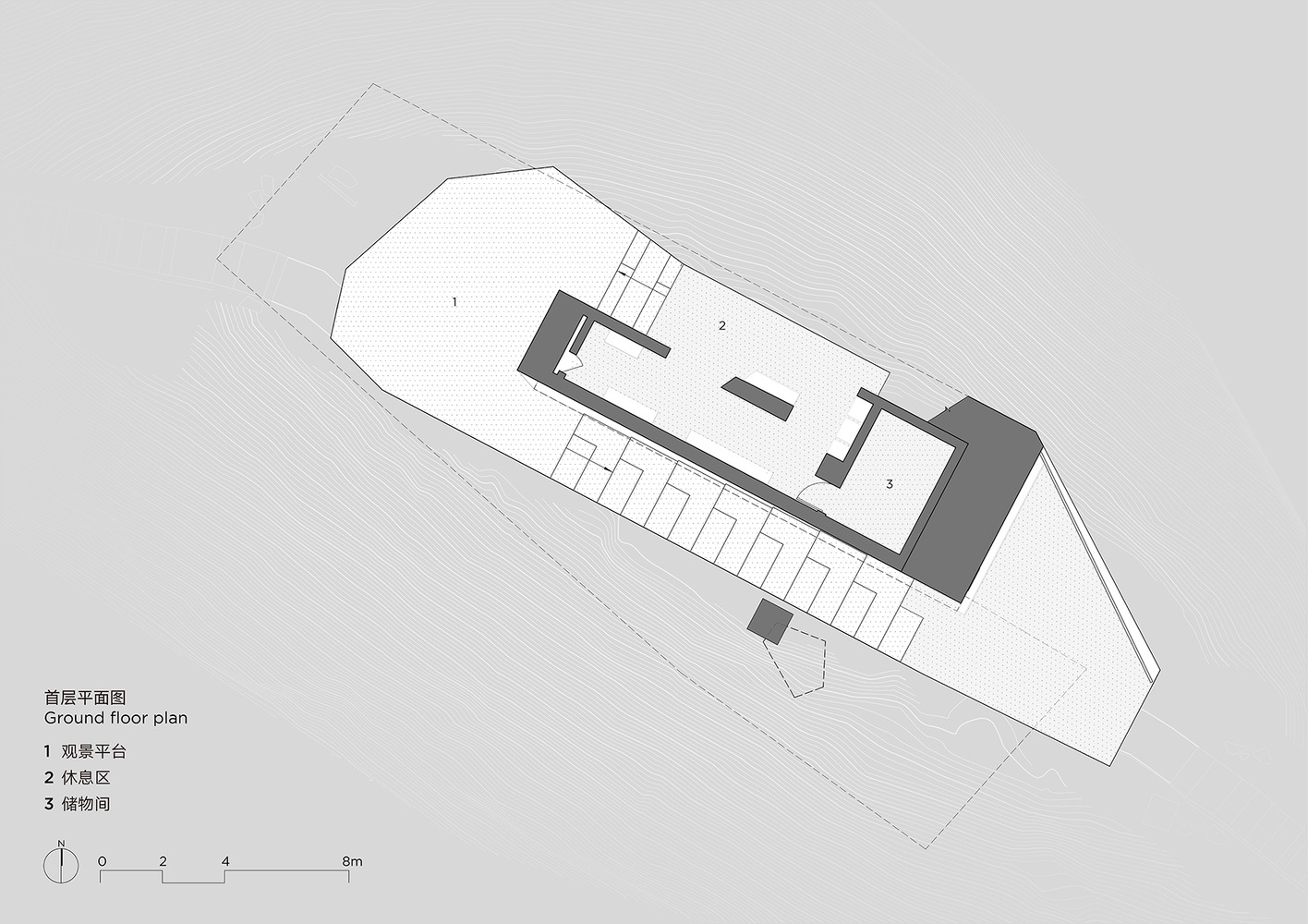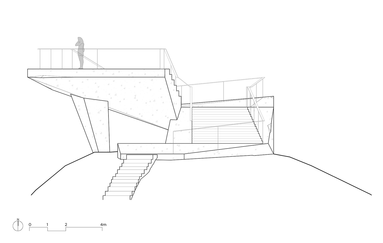 Above this, a single structural volume was created—an "artificial stone" that integrates with the ridge and continues the visual language of surrounding rock formations.
