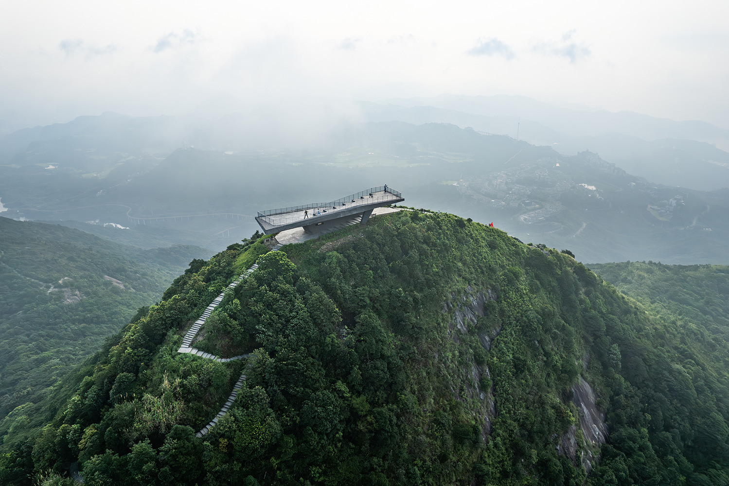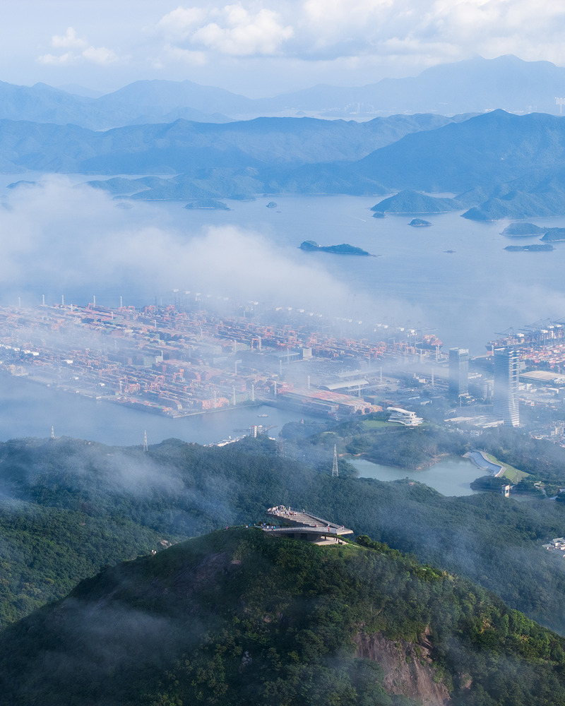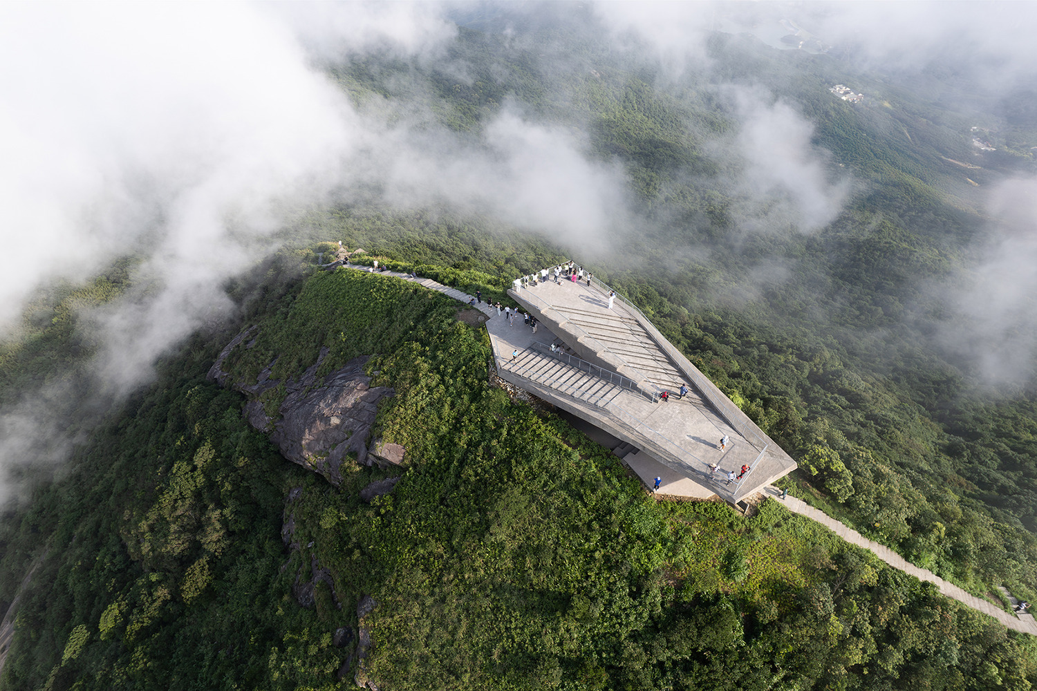 The completed observation platform integrates with the terrain rather than competing with it. It provides shelter from wind and rain, resting areas for hikers, and a stable vantage point, while preserving the mountain's geological continuity.