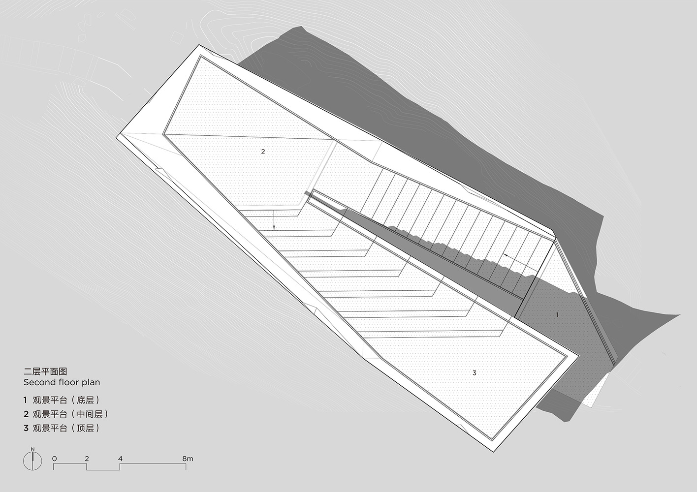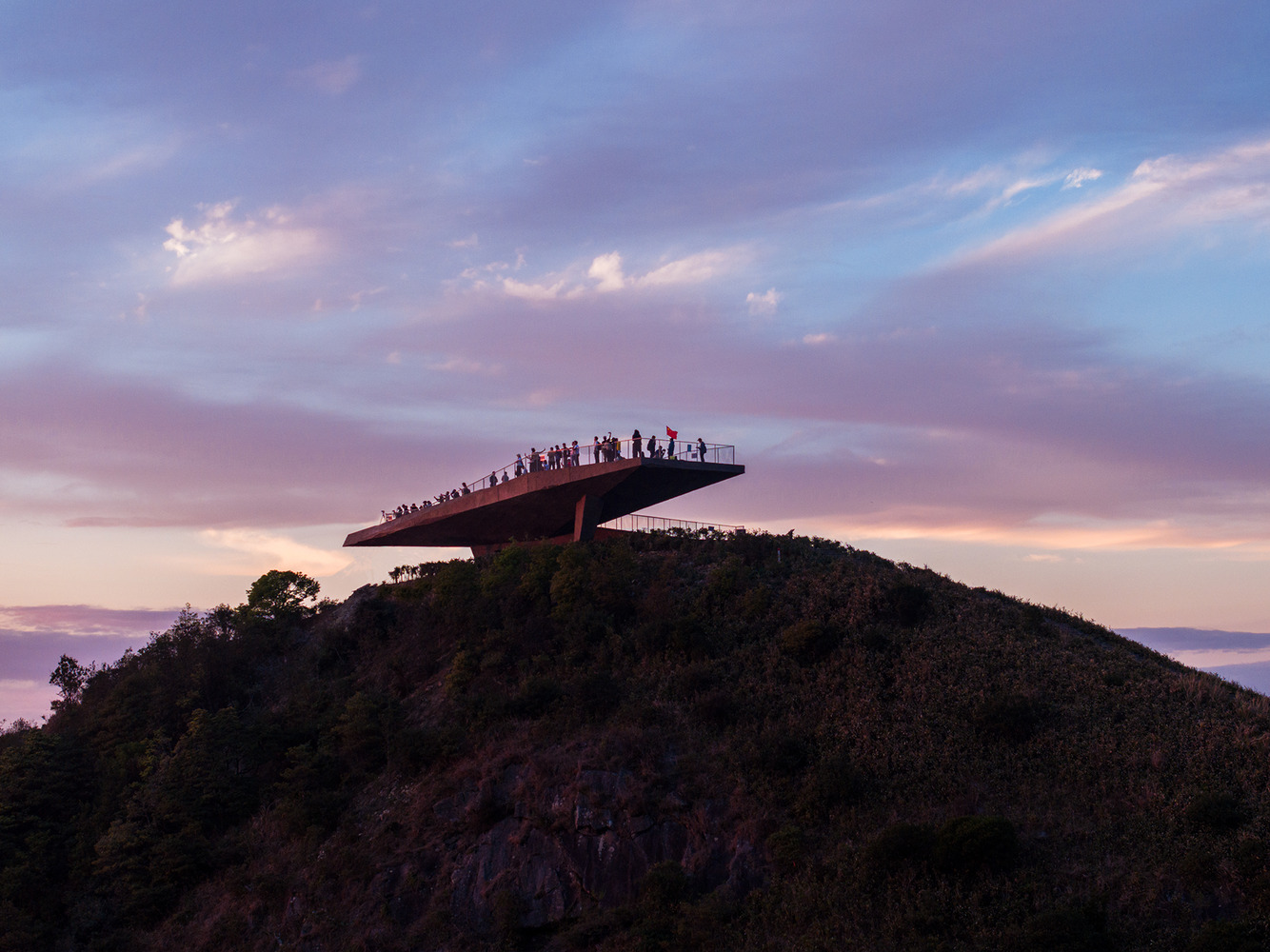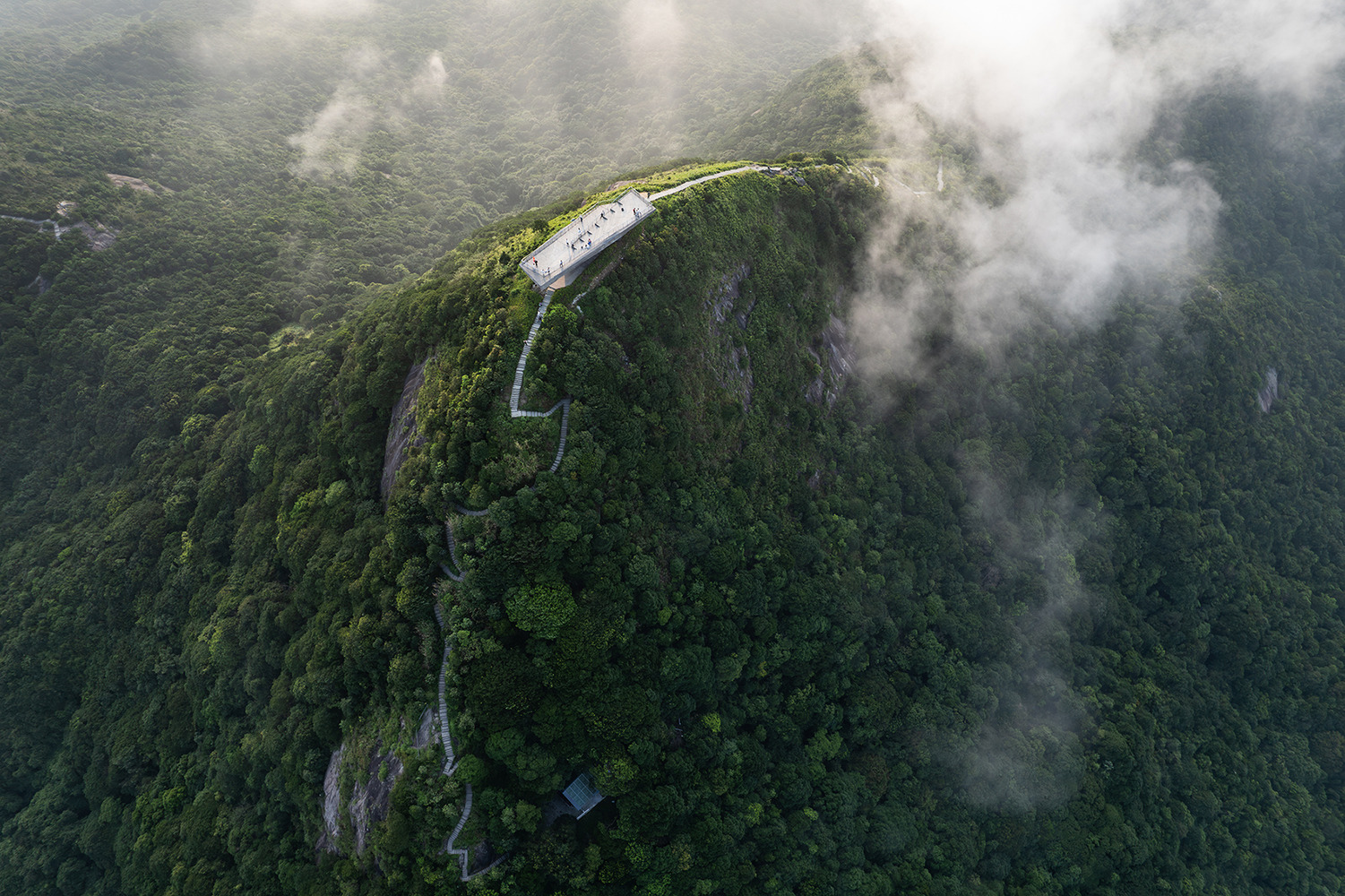 The completed observation platform integrates with the terrain rather than competing with it. It provides shelter from wind and rain, resting areas for hikers, and a stable vantage point, while preserving the mountain's geological continuity.