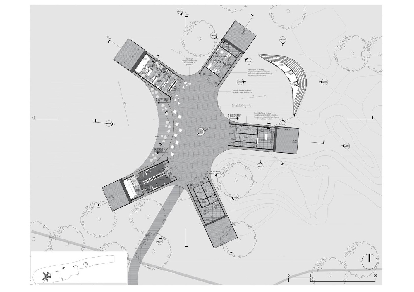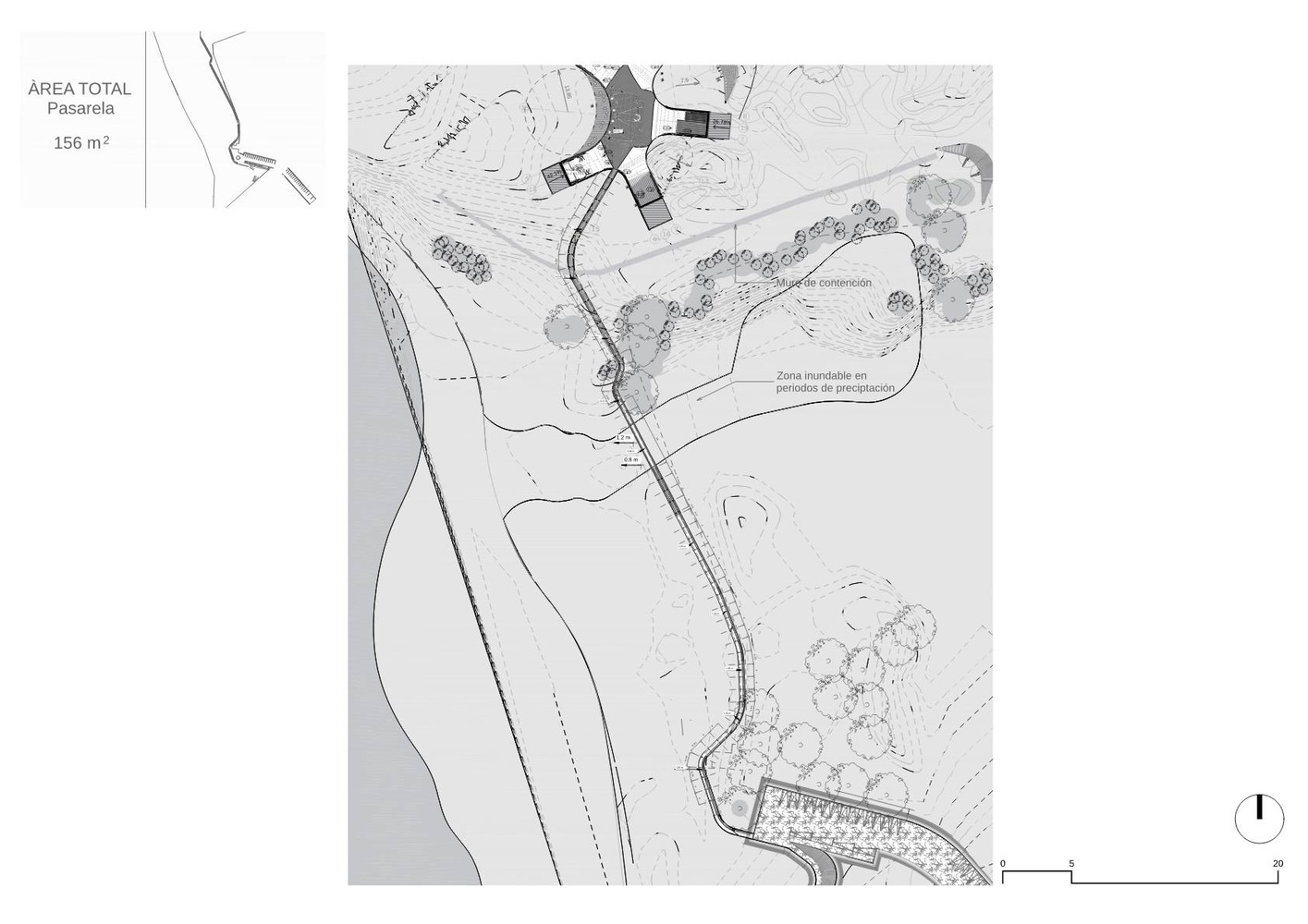 Its winding elevated pathways prevent flooding and organically connect the parking areas with the architectural elements of the program.