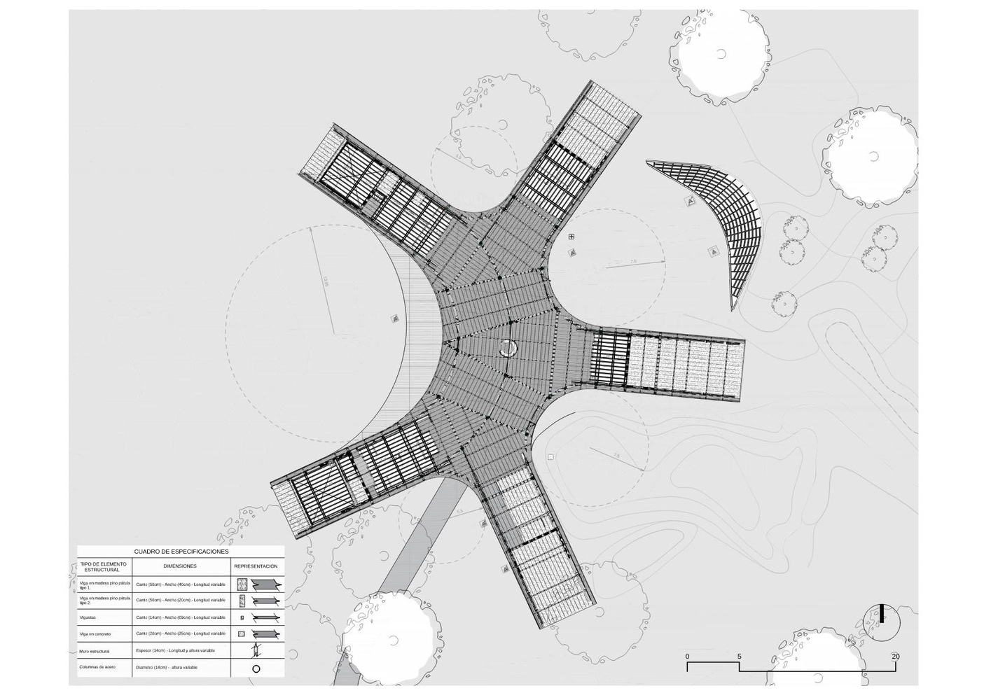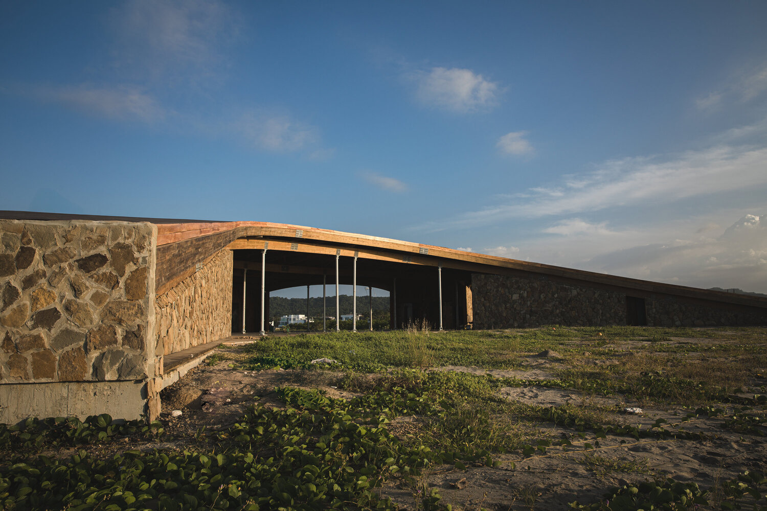 This facility is developed as a large elevated cover of sand, providing interior spaces that enhance thermal comfort and accommodate the activities of the program.