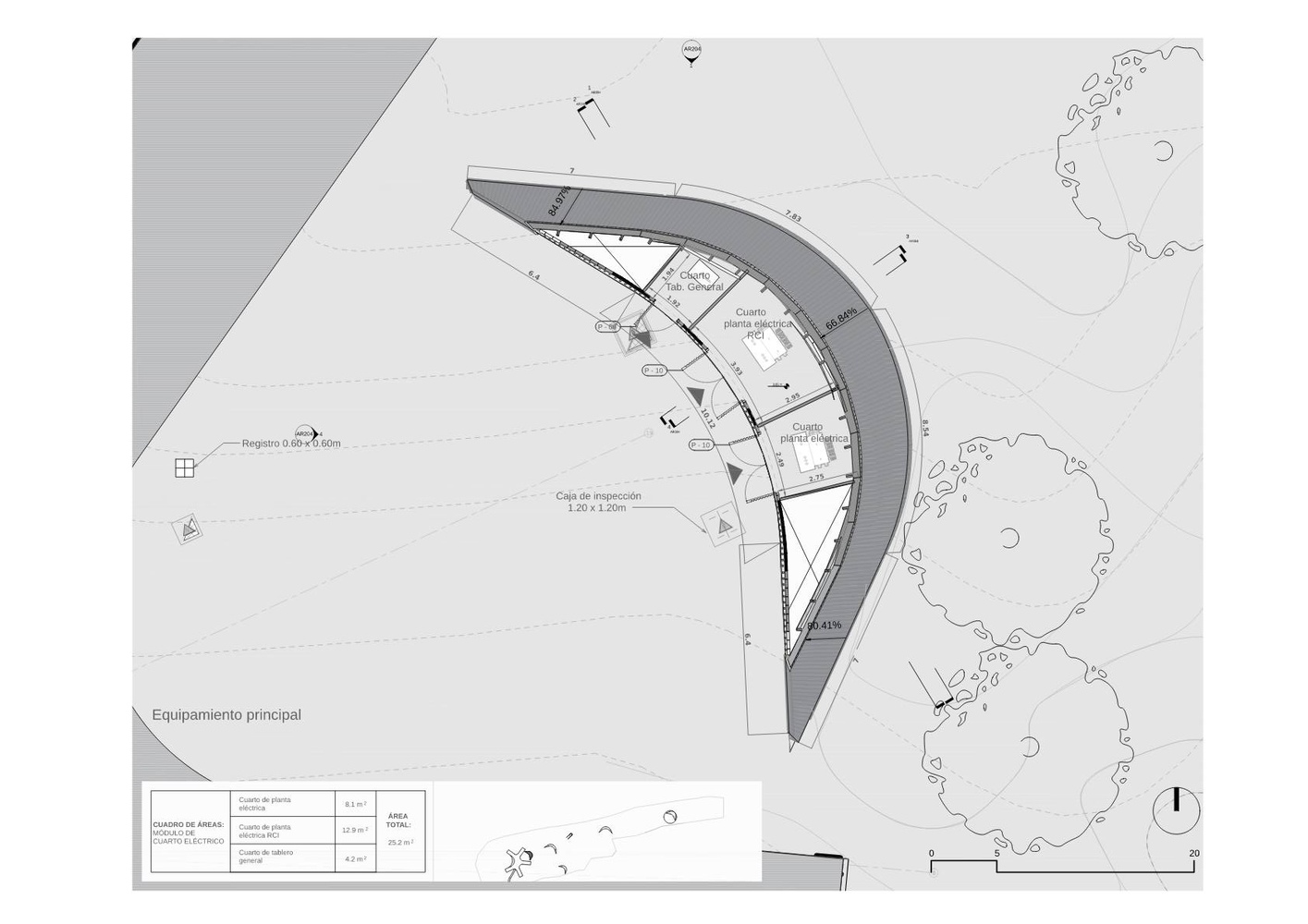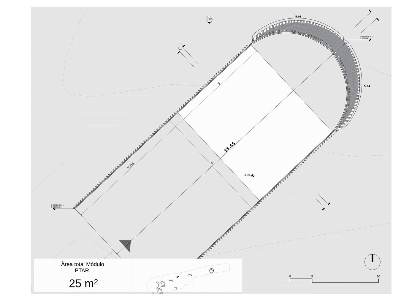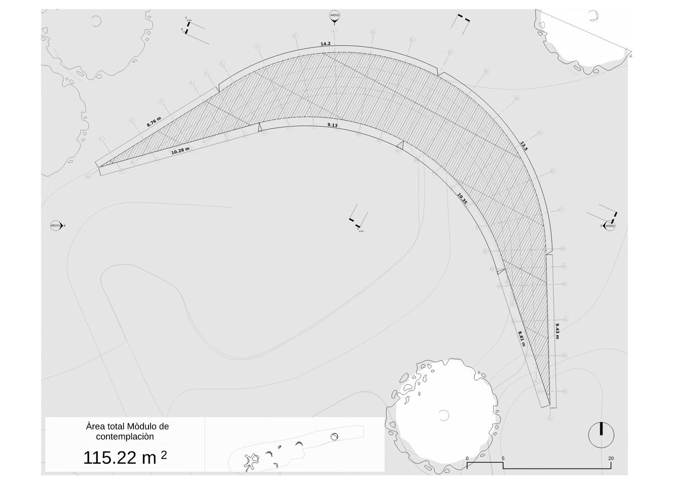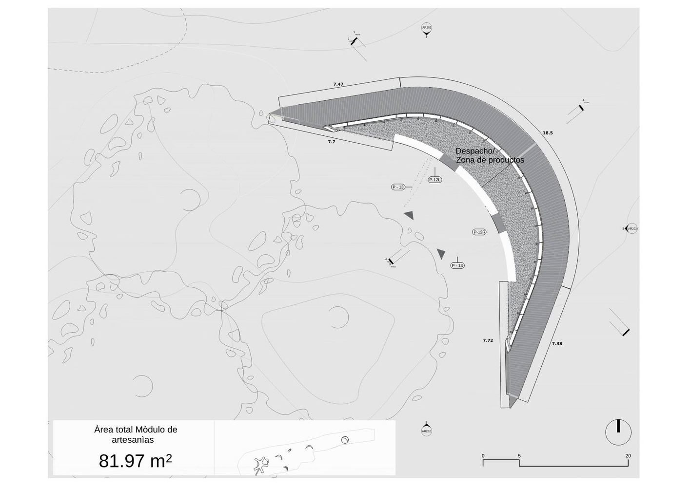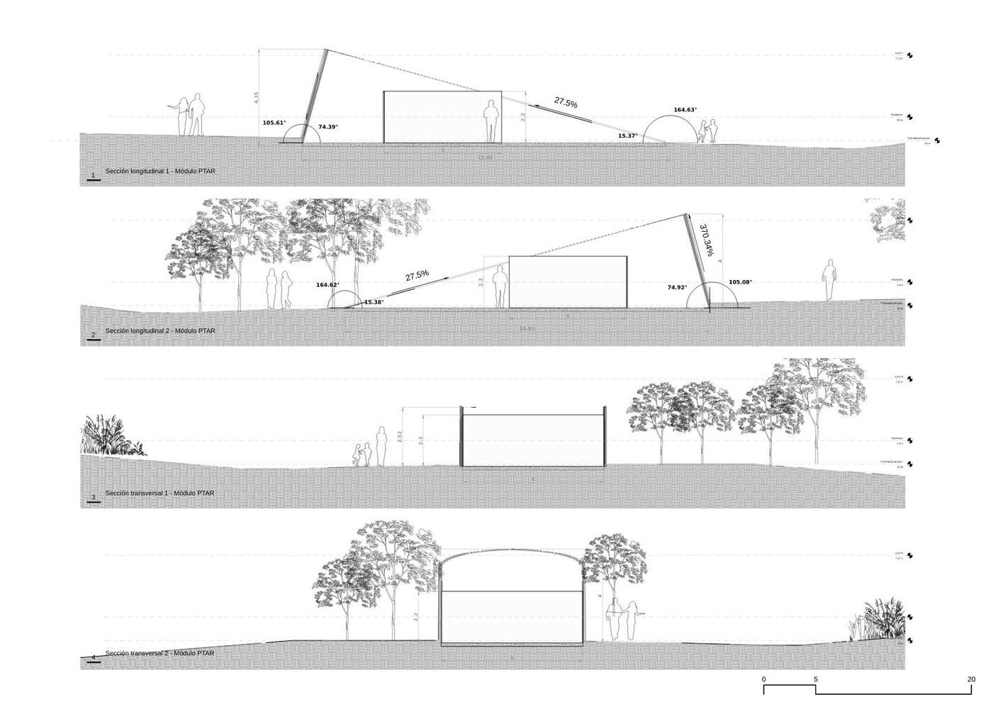 The architectural project is divided into three main parts. The first focuses on the development of dunes or landscaping caps, designed to protect the main equipment from the prevailing northwestern winds.