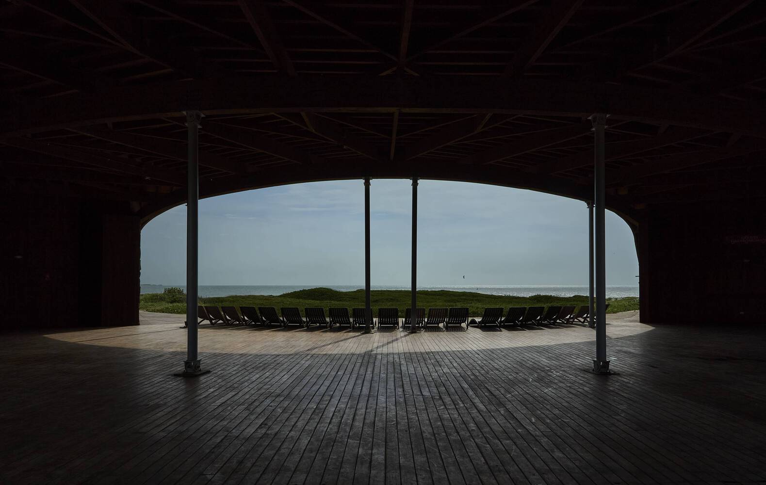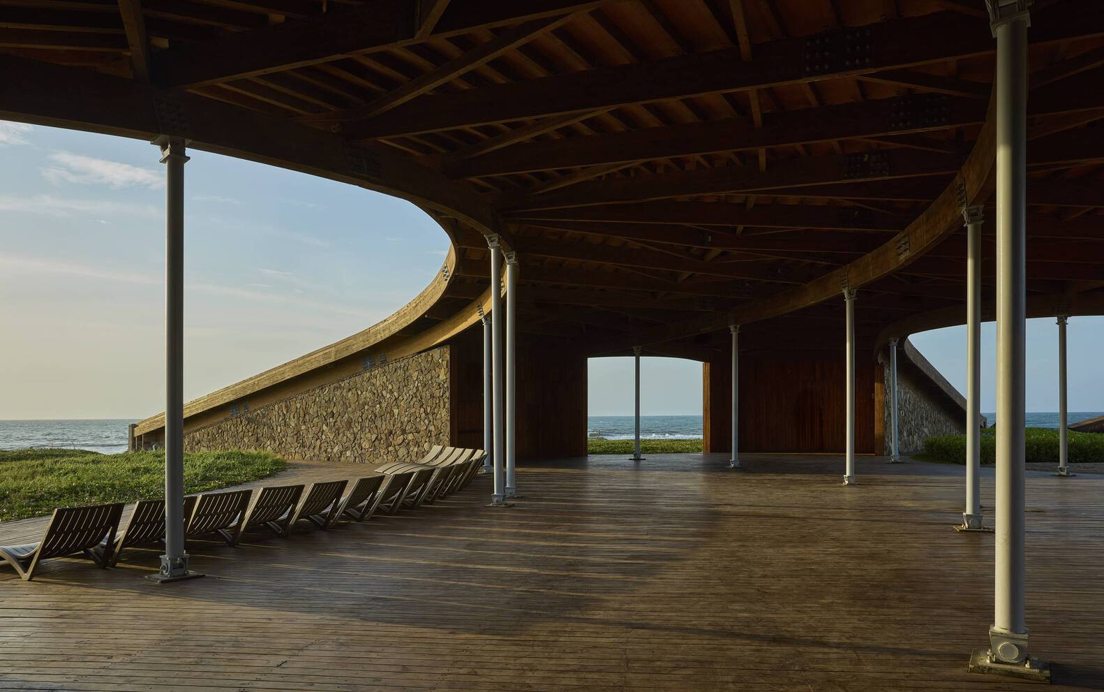 Wood is primarily used in its materiality, adapting to the curved design of the dune's surface.