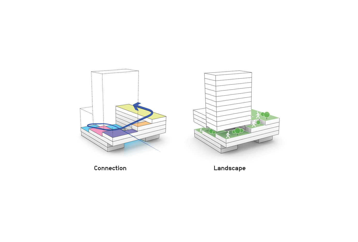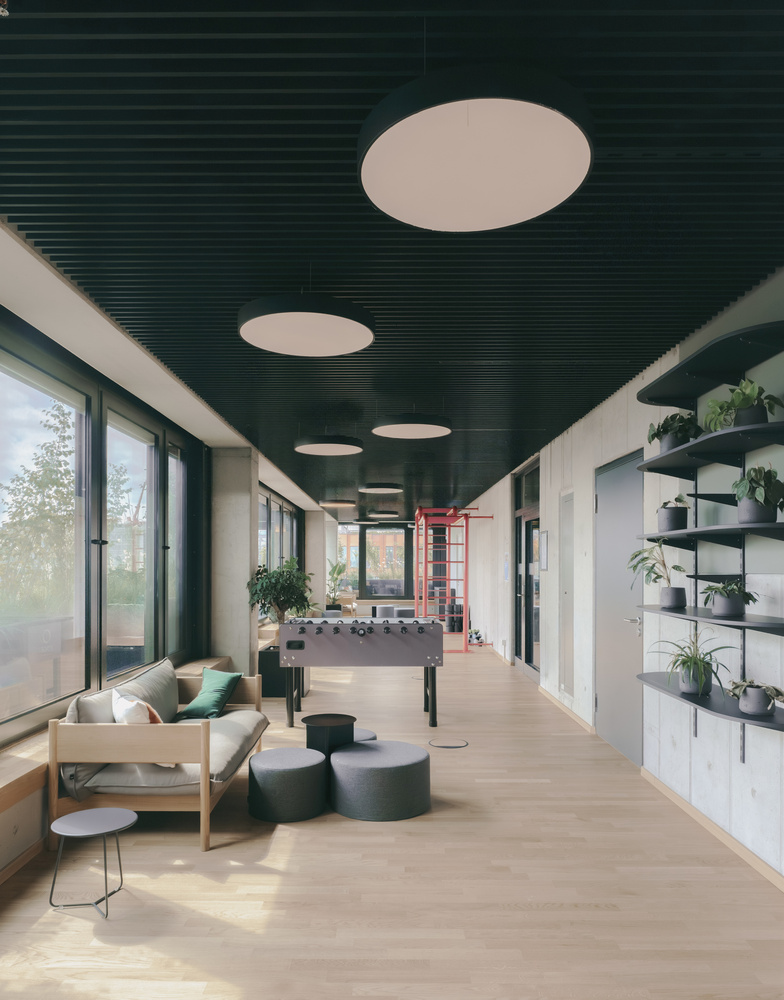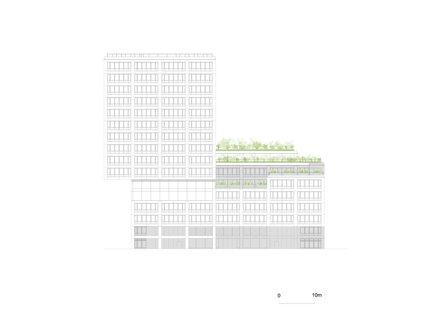 They are designed as communal areas accessible to all tenants, while a lushly planted roof terrace encircles the building to provide space for recreational purposes.