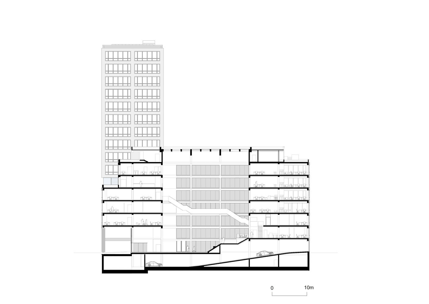 The new build comprises two parts: a squareshaped seven-story structure and a tower rising to a total height of almost 60 meters in the southwest corner.