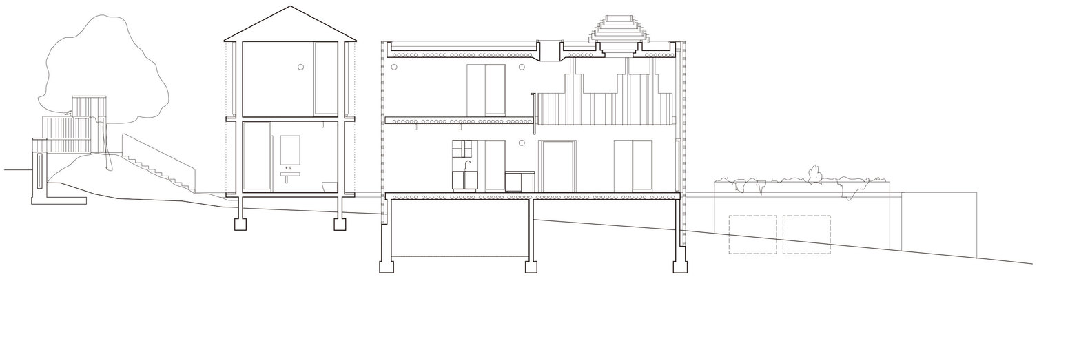 The house design takes the form of a series of independent objects emerging from the steep terrain. Moving between the parts reveals different qualities of the spaces and the subtropical landscape.