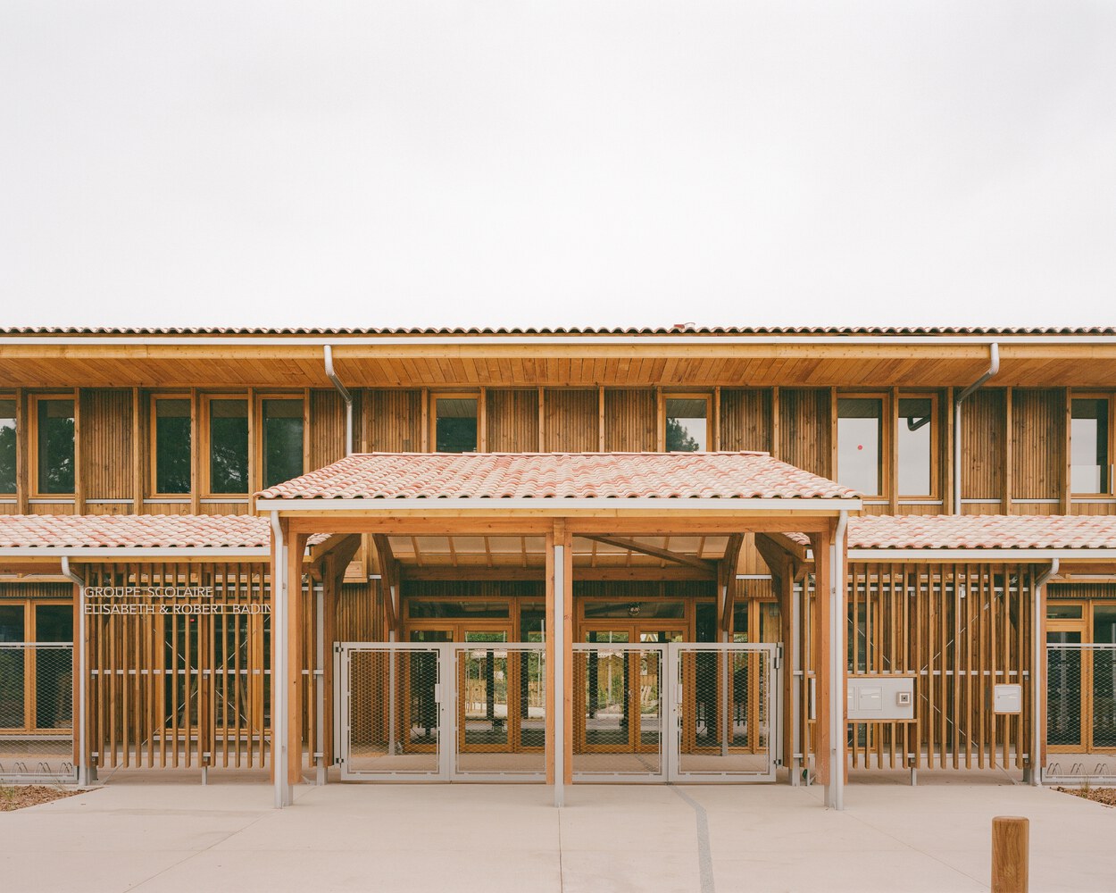 With ultra-local wood from the forests of Audenge and the Landes de Gascogne, raw earth from the site, oyster shell paving stones, Gironde straw, and reused dredged sediment from the Arcachon basin, this school is part of its territory and showcases bio-based materials from local industries.
