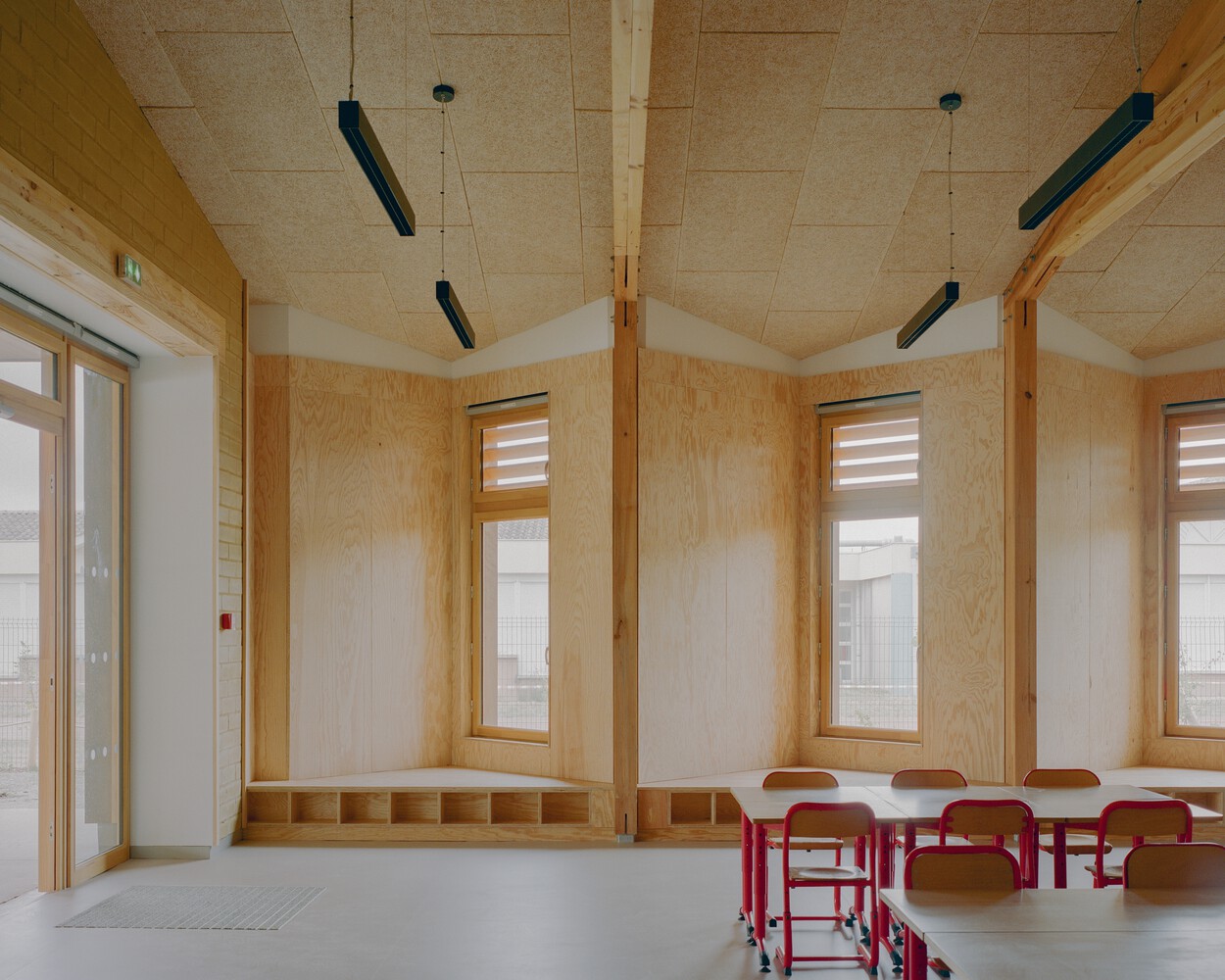 This new school is built with respect for existing life and biodiversity. Constructed around a pre-existing wood, a true preserved living heritage, the U-shaped building creates a protective cocoon where nature and learning spaces are intertwined.