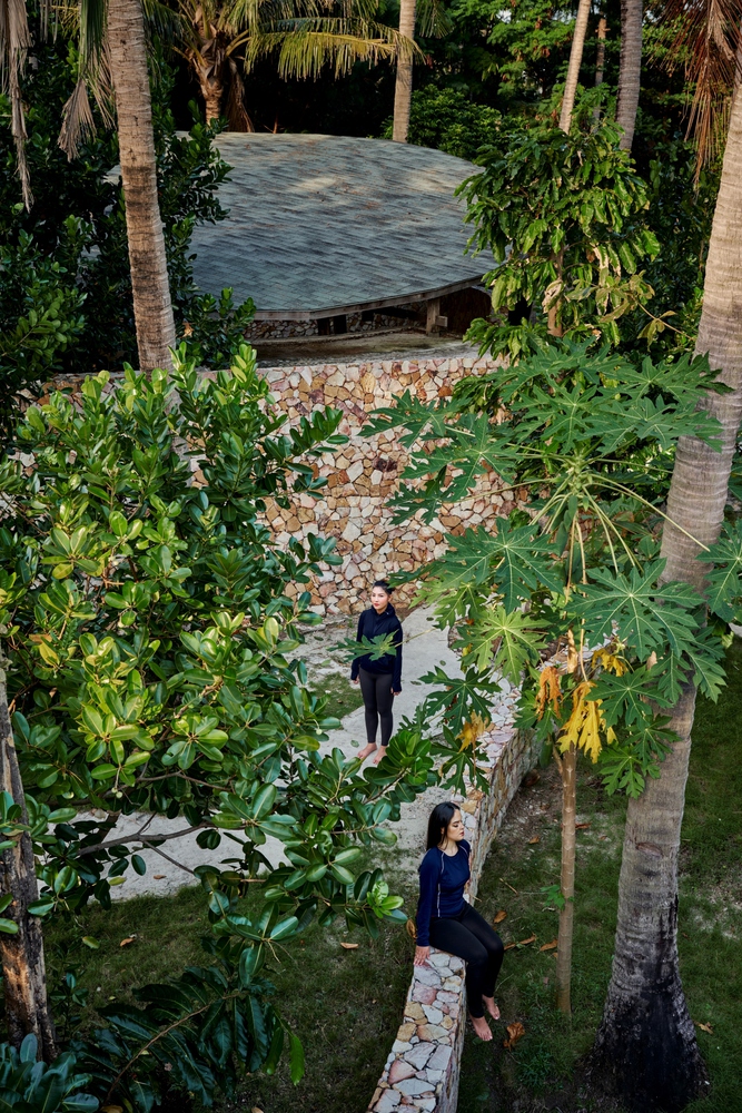 The island will later offer a diverse range of high-quality services, making it an ideal place for relaxation and rejuvenation. The yoga garden is one of the amenities that enhances the natural scenery, with sunlight creating a constant play of shadows on the carefully crafted natural stone surfaces.