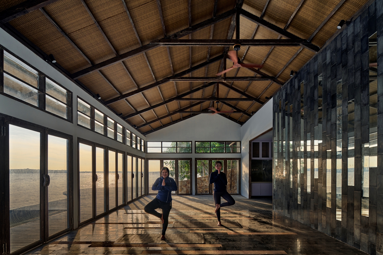 Wrapped in wood shingles for the roof and featuring a rattan ceiling, the oval floating roof tilts to the east, allowing morning natural light to penetrate for yogis and divers as they start their day.