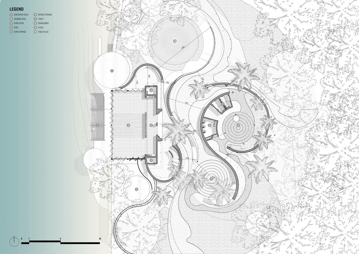 The limestone-reinforced rammed earth walls transition physically to the exterior and optically divide the garden into four sections: the yoga plaza, the gym area, the indoor diving classroom, and the sunset deck.