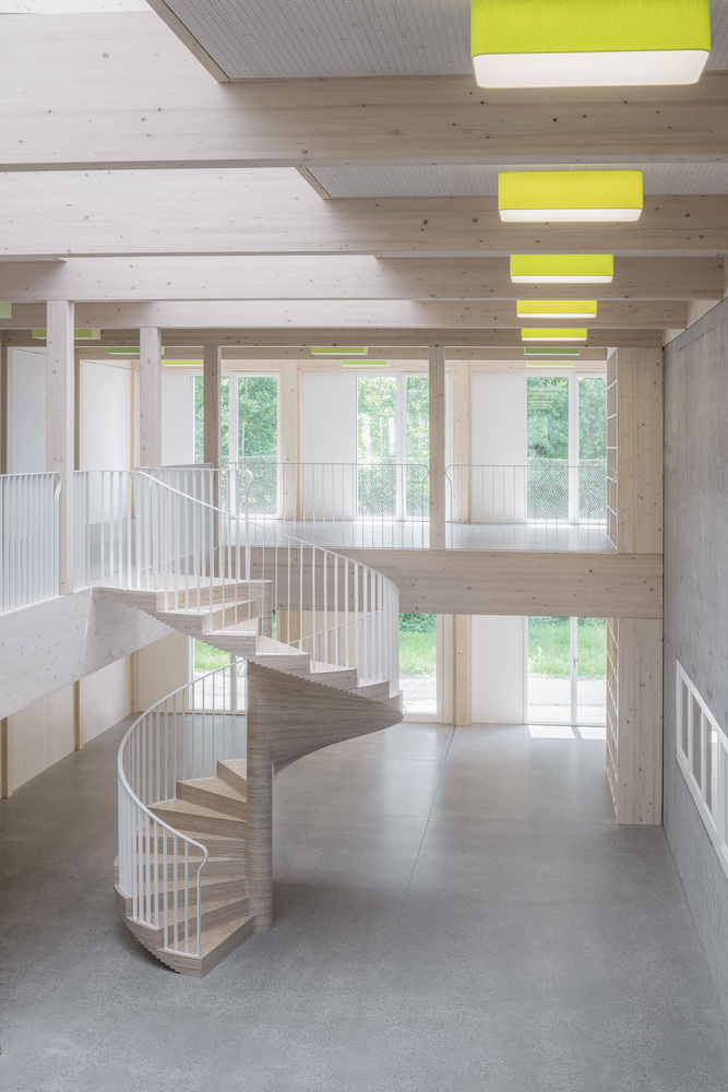 The new rooms are divided between two buildings. In the centre of the campus, a two-story construction houses the spaces collectively used by all pupils – assembly hall, library, and day school.