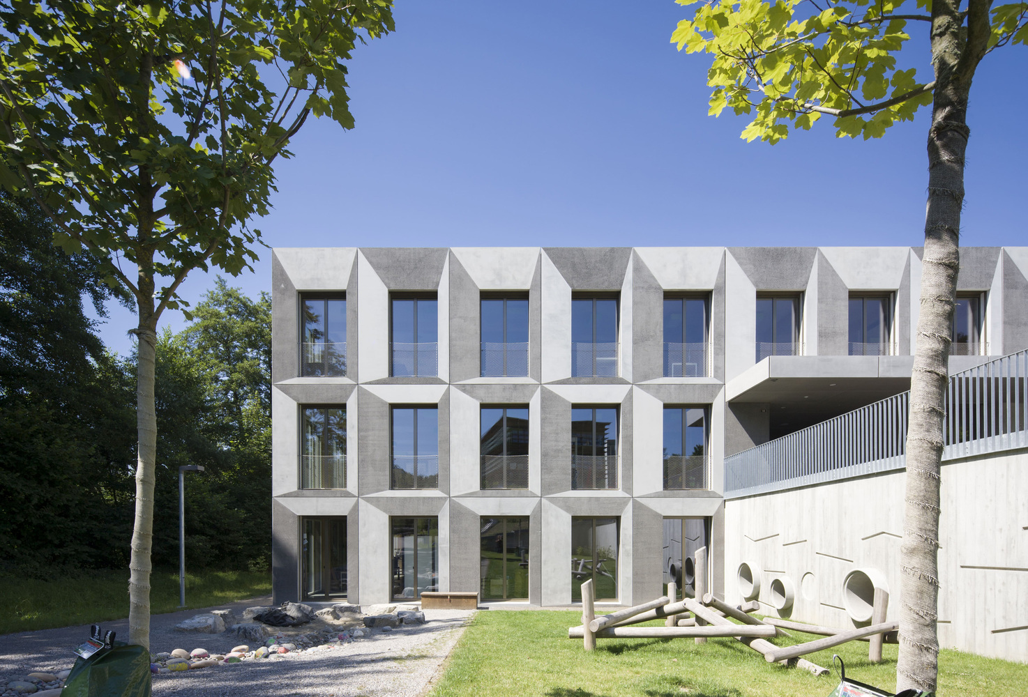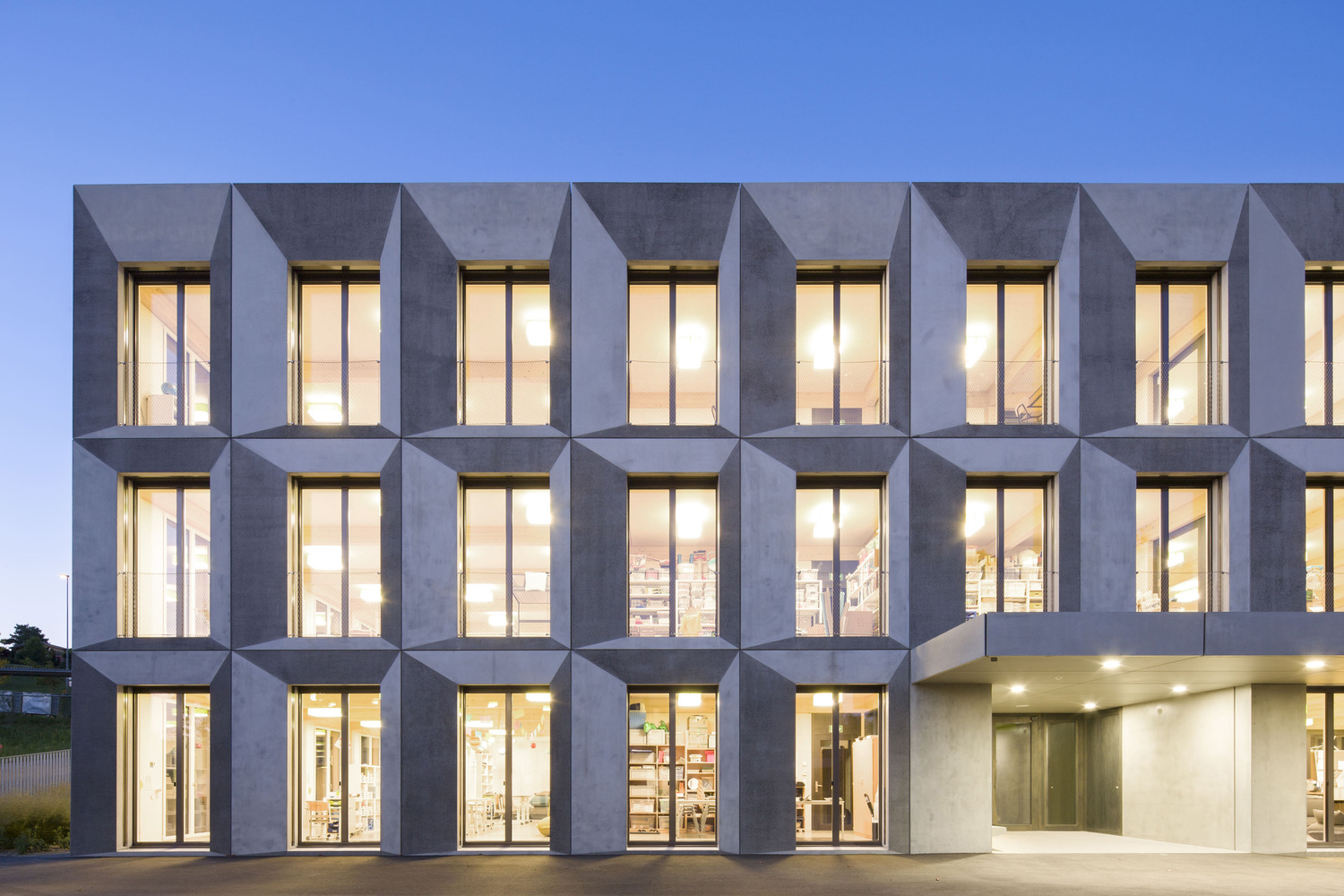 The very rational façade is simple, repetitive, and rectilinear, but with its alternating smooth and sandblasted surfaces, it is given an almost playful appearance.