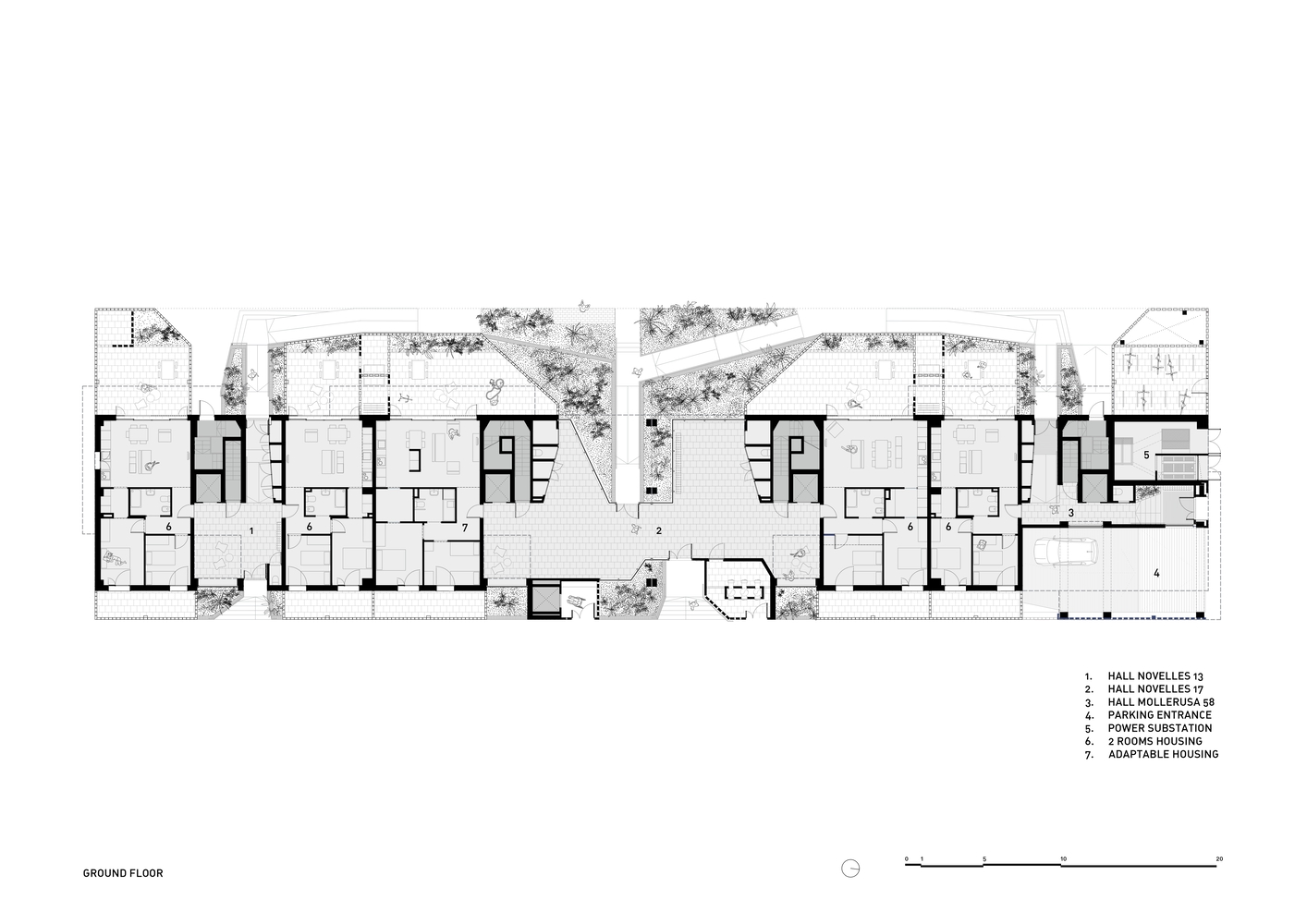 Our initial concern was to restore the neighborhood's sociability, which had previously developed at street level. The first hurdle to overcome was the impact on pedestrians of this new urban scale of the open block, for which we developed several strategies.