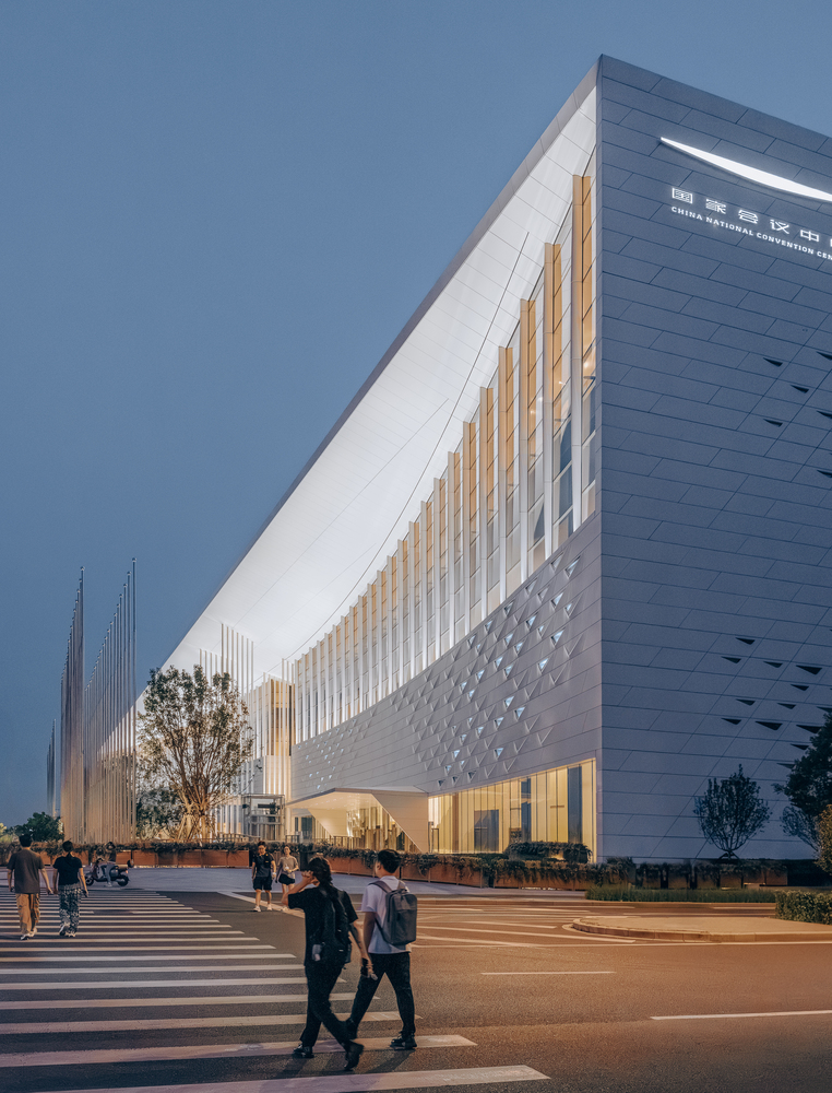 Along this axis, defined by a series of iconic buildings, the new Phase II of the China National Convention Center introduces a completely new architectural language.