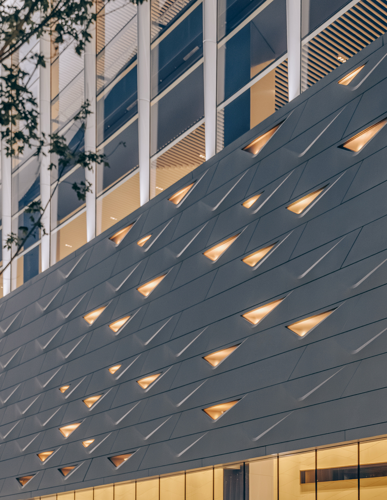 On the east side, vast enamel-coated steel panels are pierced with triangular openings, their pattern evoking flocks taking wing while balancing light and shade.
