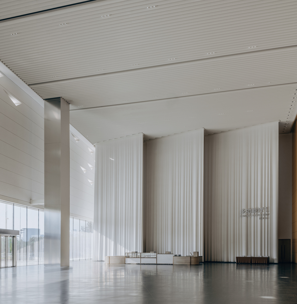 The curtain wall, shaped parametrically, shifts between light and shadow, solid and void, like clouds dissolving in mist. Enamel-coated steel was chosen for its crystalline surface, durability, and deep cultural resonance in China.