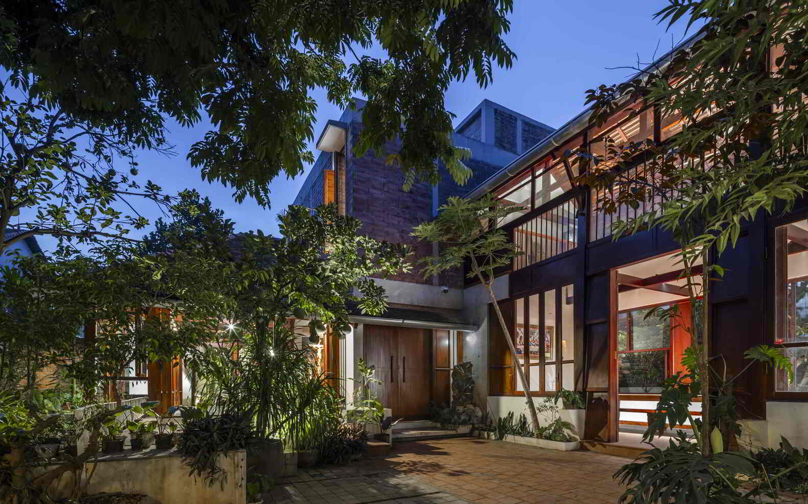 Therefore, the design focuses on making a communal living space on the ground floor, including a living room, workspace, a bedroom, indoor and outdoor kitchens, gardens, and a fish pond.