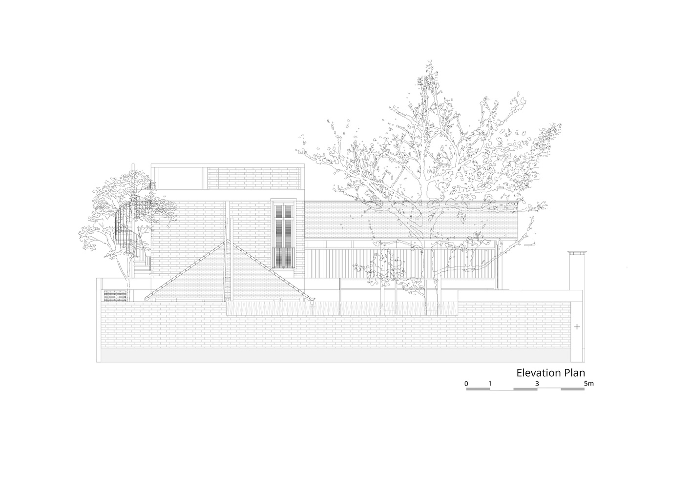 The project is located near a long-standing brick kiln, and inspired by the owner's desire for a traditional home embraced by nature, terracotta tiles and red bricks were chosen as the primary materials.