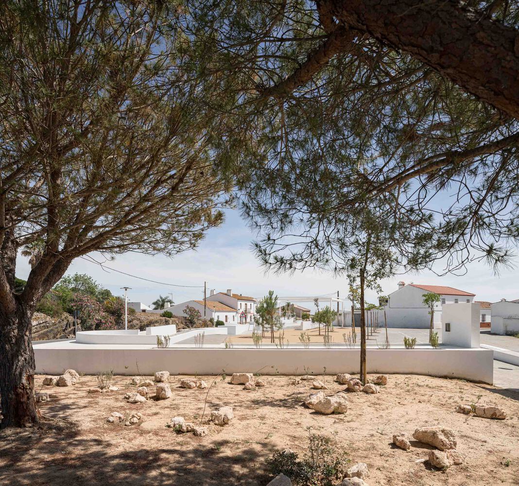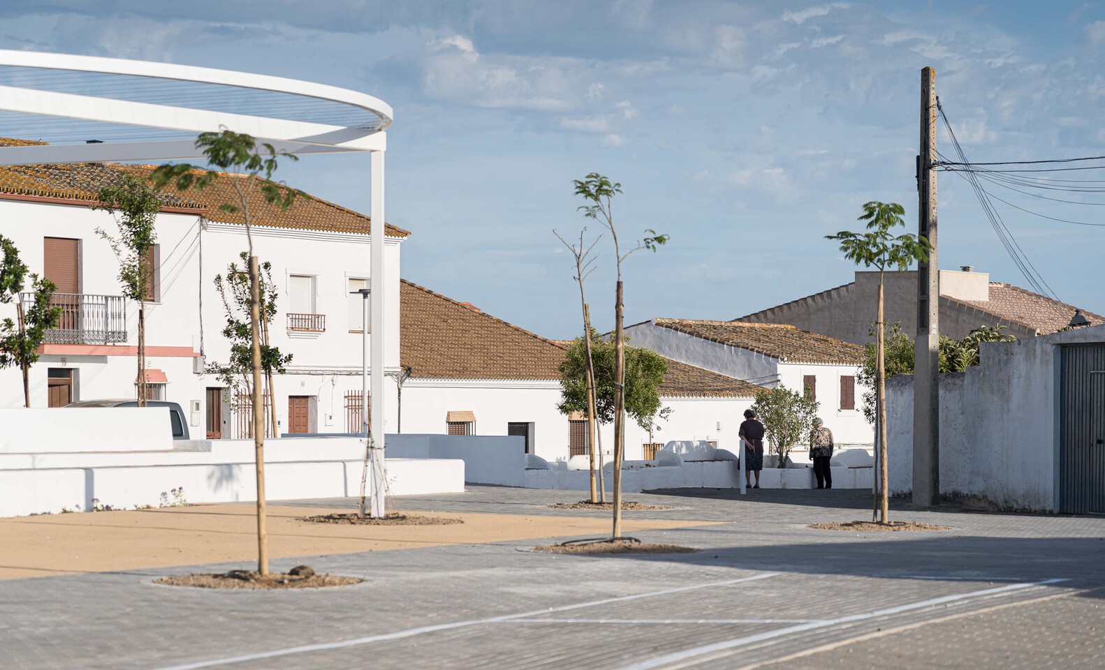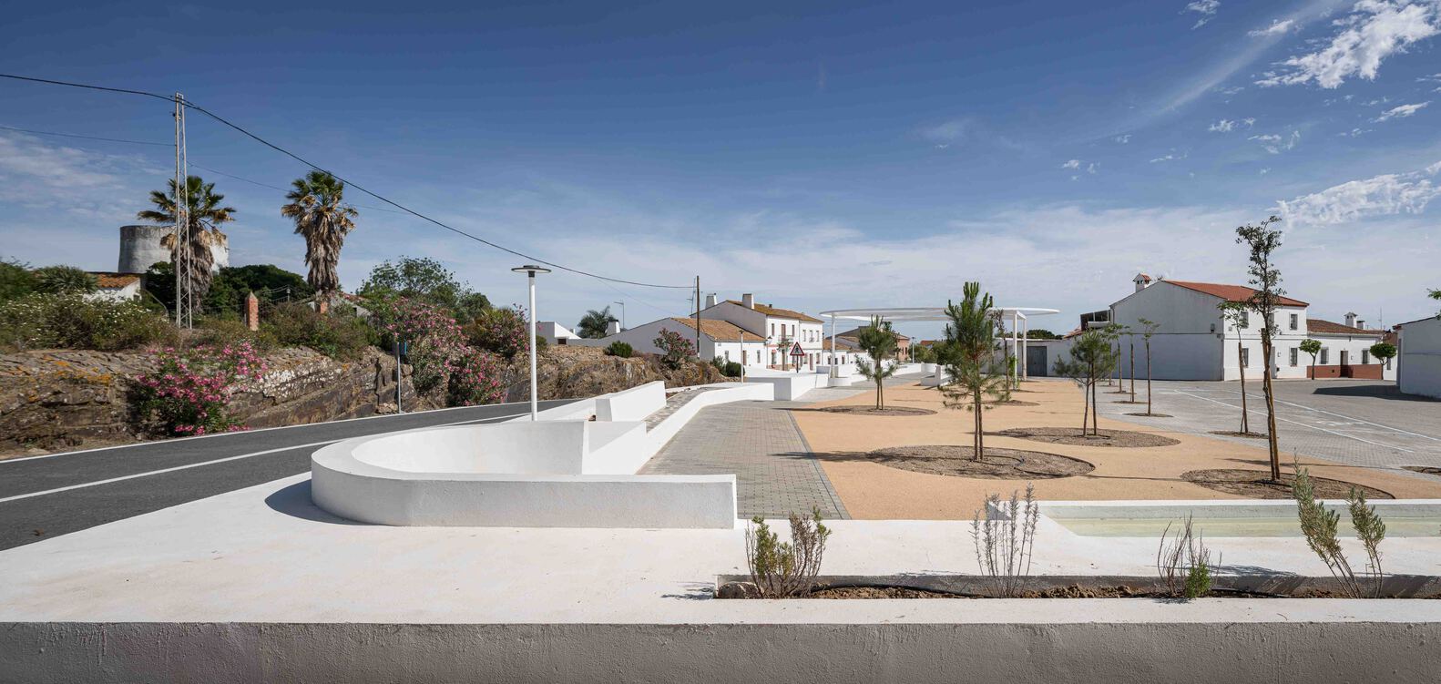 The square is shielded from the noise and pollution of vehicles through the construction of elements such as fencing that integrates seating areas, tree pits with native Andévalo vegetation such as strawberry trees, holm oaks, and rosemary, as well as water points and spots from which to observe the landscape.