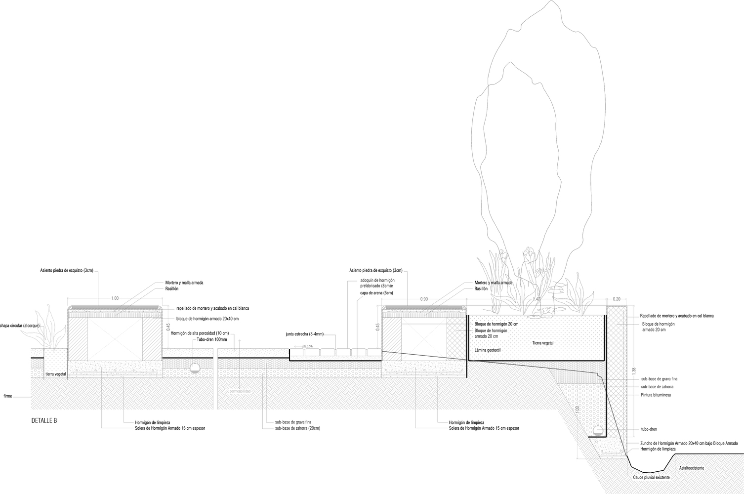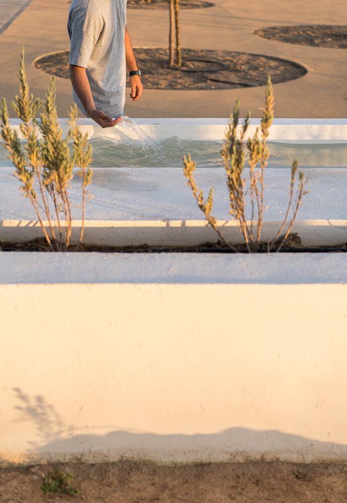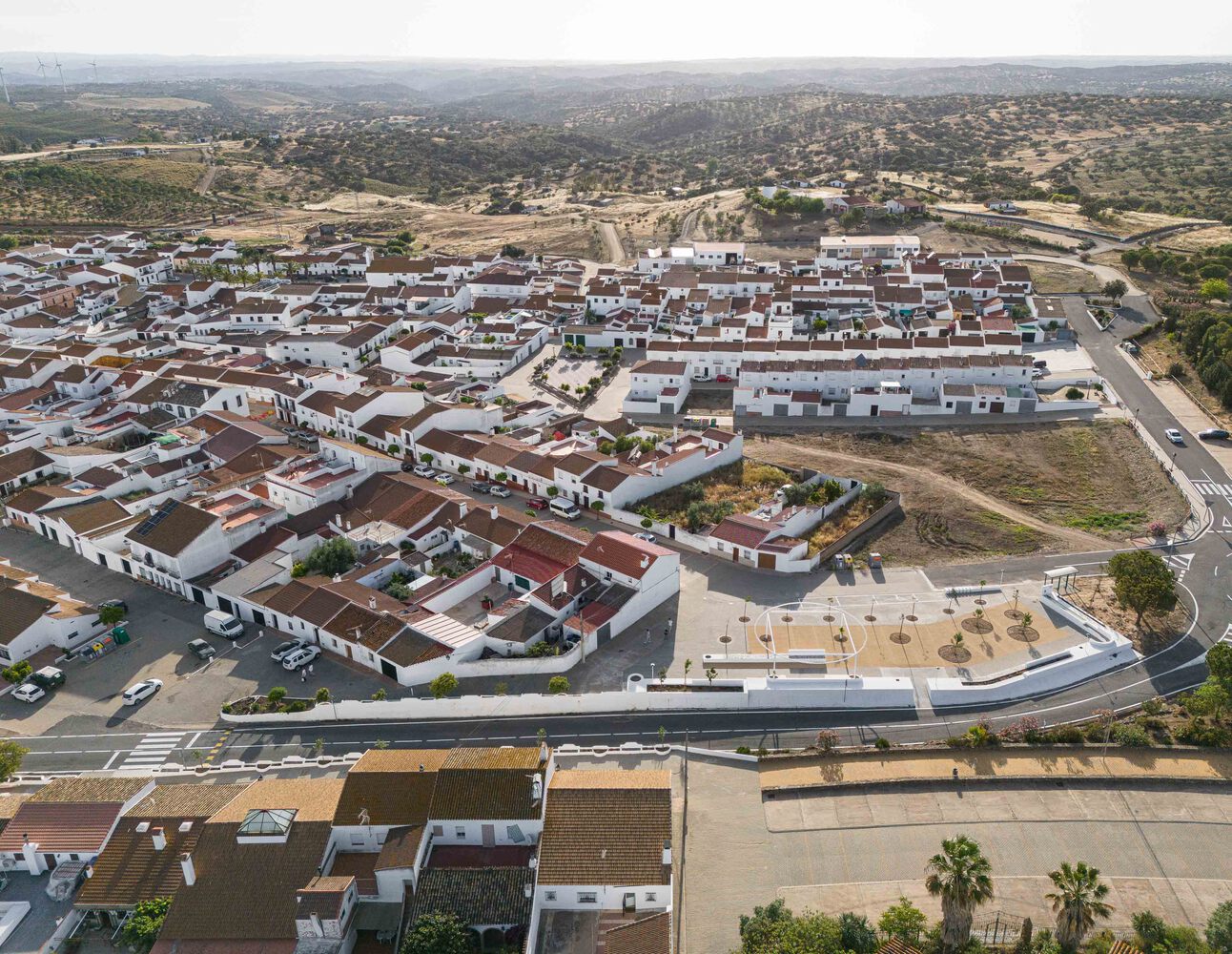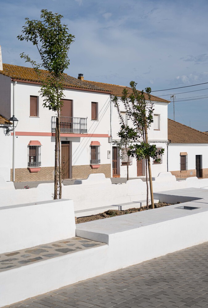 The square is shielded from the noise and pollution of vehicles through the construction of elements such as fencing that integrates seating areas, tree pits with native Andévalo vegetation such as strawberry trees, holm oaks, and rosemary, as well as water points and spots from which to observe the landscape.