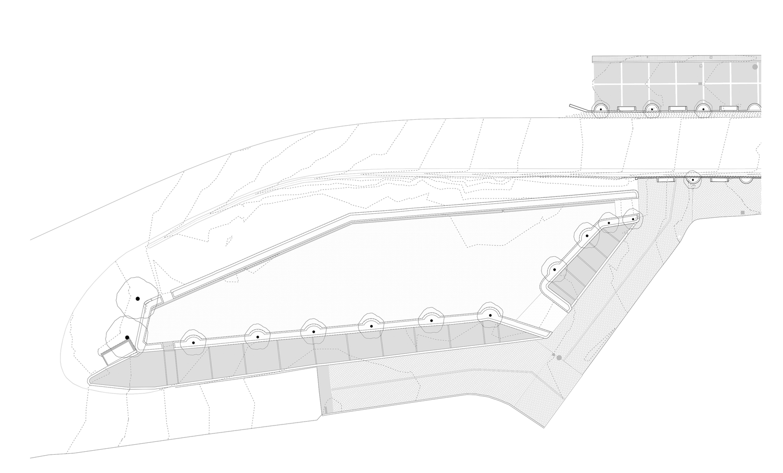 Under the existing pine trees, the project is completed with a water feature and a pillar that bring sound and moisture to this space at the edge of the urban area.