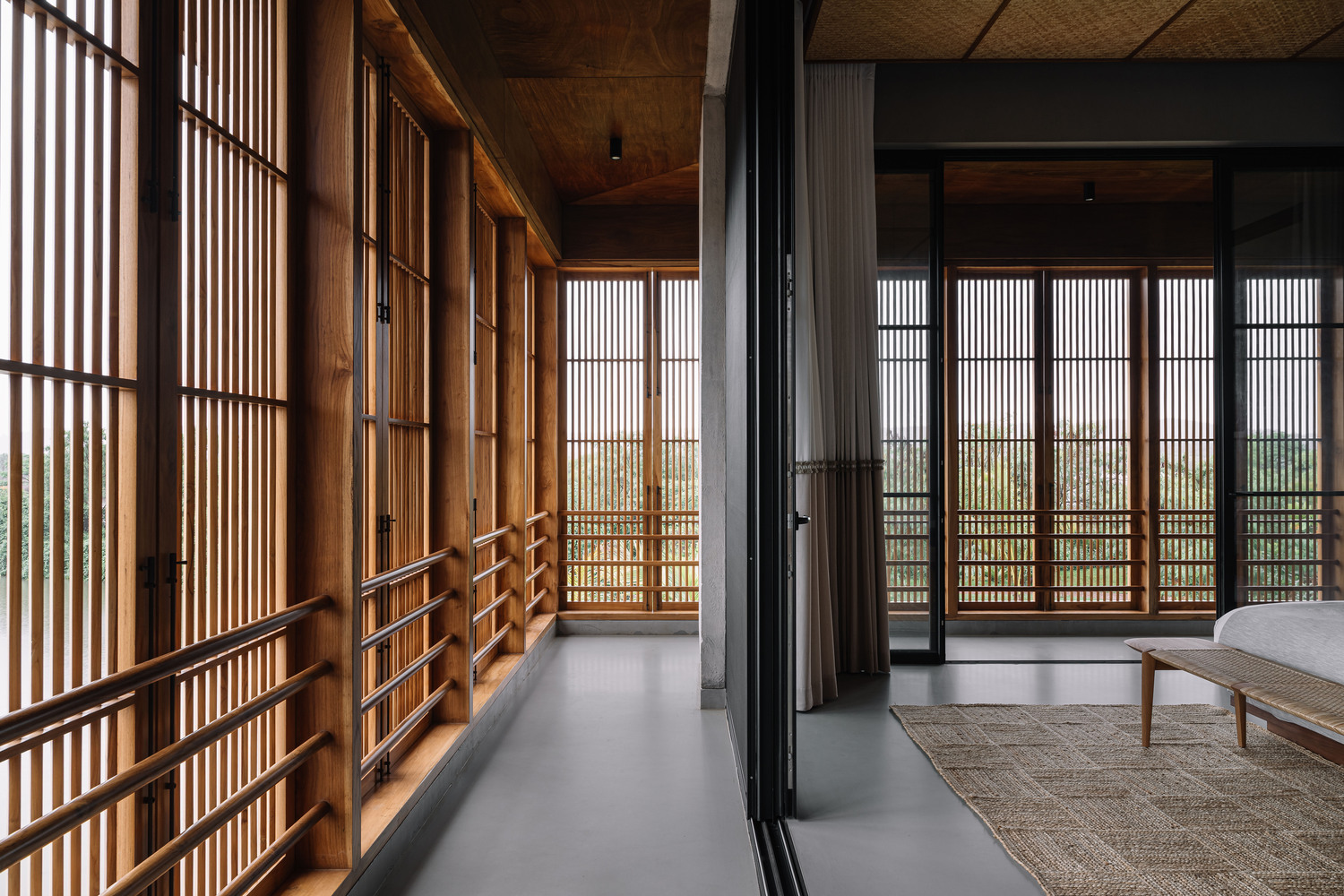Encircling this level is a continuous balcony shielded by openable teak wood louvered screens.