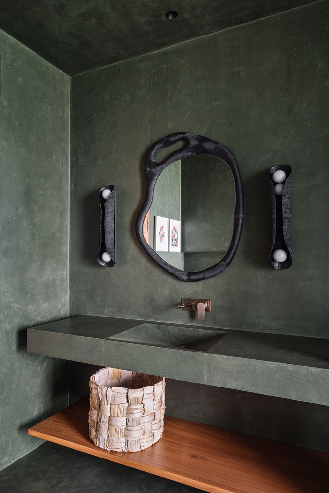 Inside, cement walls and floors in hues of grey, black, green, mustard, and terracotta speak to a curated rawness, softened by accents of cane, exposed plywood, and richly veined Indian granite.