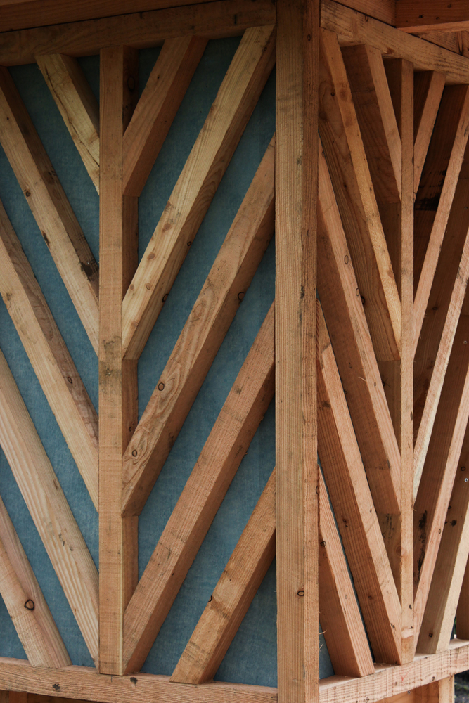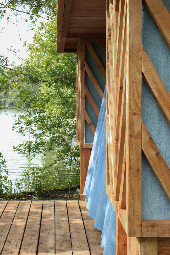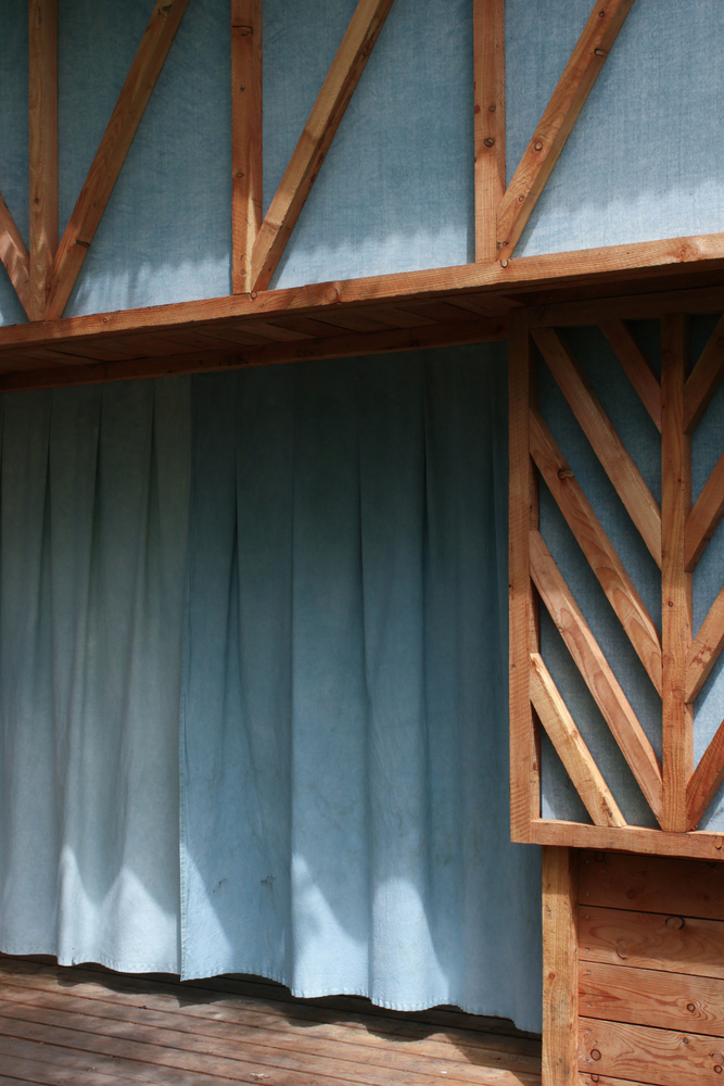 The structure, made of regional wood, reinterprets traditional « colombage » with an unusual infill: a textile, identical to that used in theatre curtains.