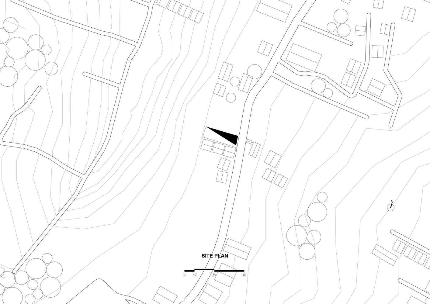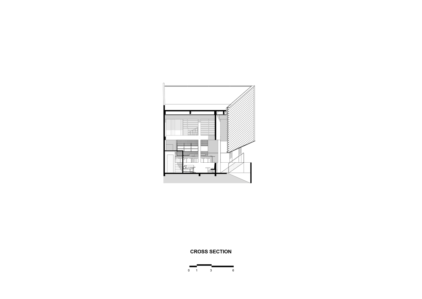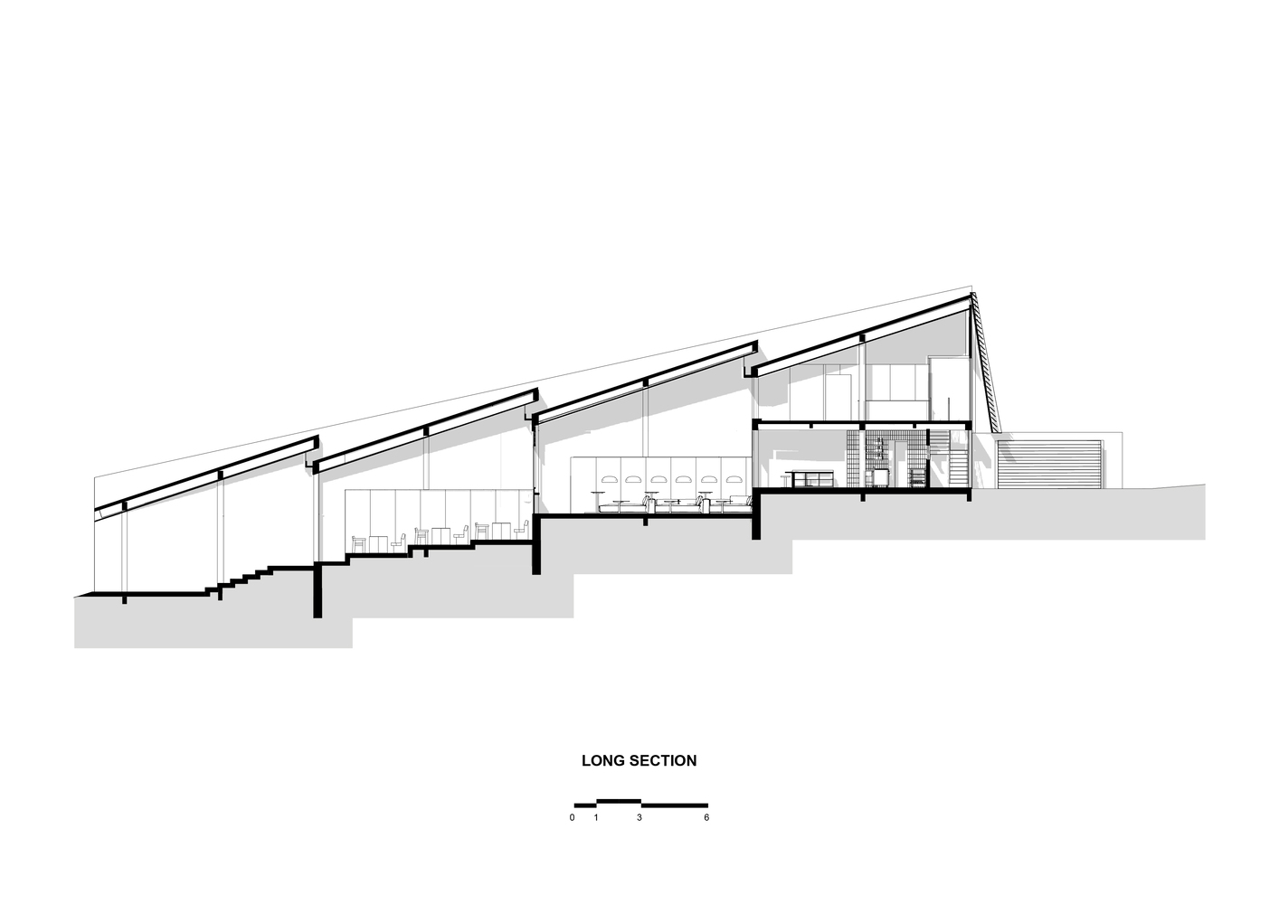 Occupying a narrow, sloping site with a 5-meter elevation drop from front to back, the building is carefully shaped to follow the natural contours of the land.