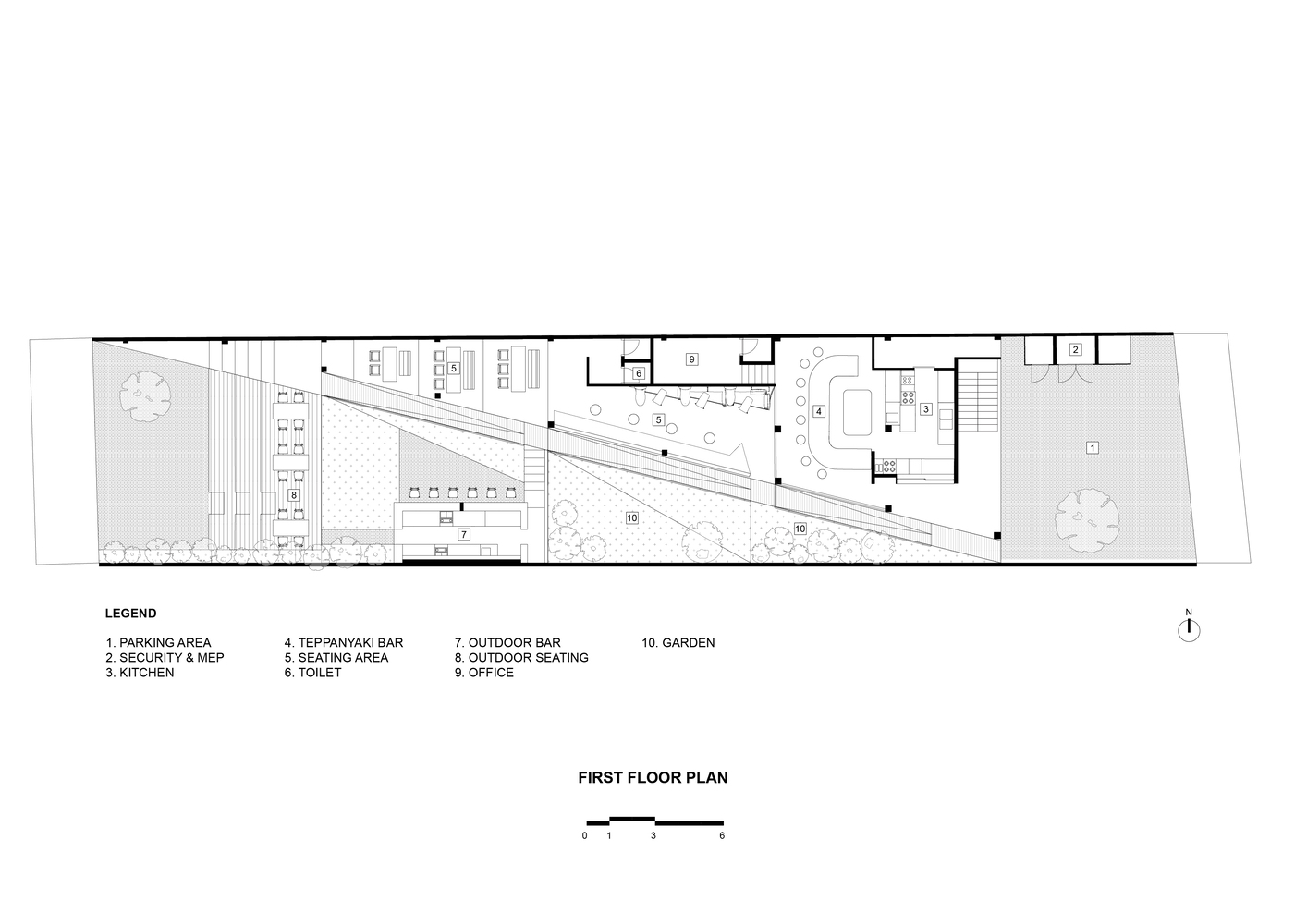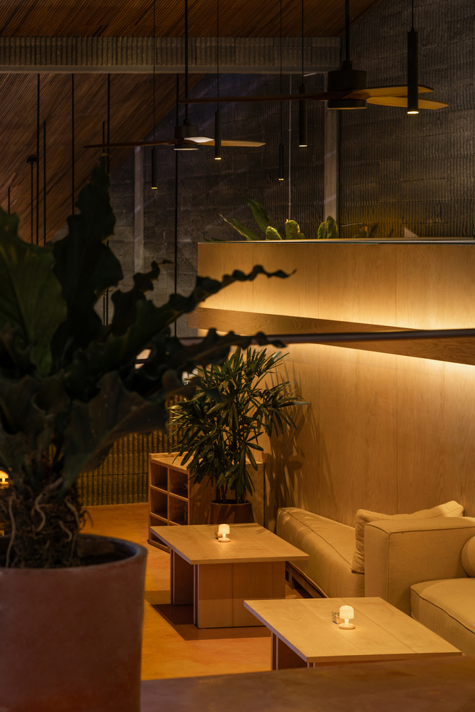 Each platform provides a distinct spatial experience: -Platform 1 (Street level): Contains the grill station and main kitchen. The bar counter is crafted from cast in-situ resin over wood, set atop a textured concrete base—establishing a tactile and elemental material palette.