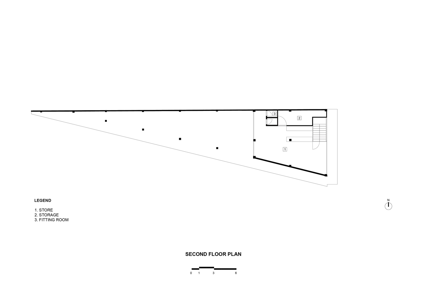 The project houses a restaurant on the ground floor and a fashion boutique above, balancing hospitality and retail within a compact footprint.