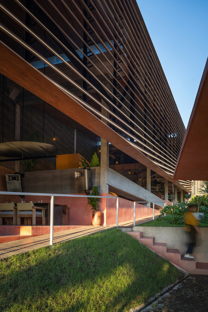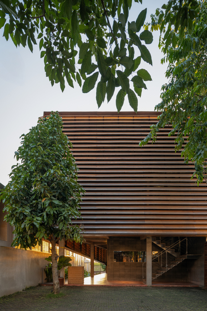 These slats function as passive shading and rain protection while allowing daylight and breeze to filter through, enhancing the building's environmental performance in Bali's tropical climate.