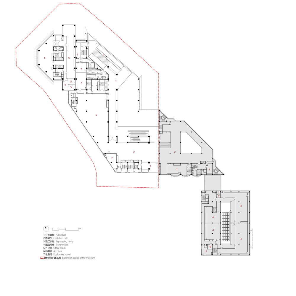 The museum complex consists of two primary elements: the renovated original structure and a new extension. The 20-year-old existing building comprises the former Humanities Pavilion and Natural History Pavilion, totaling 14,700 m².