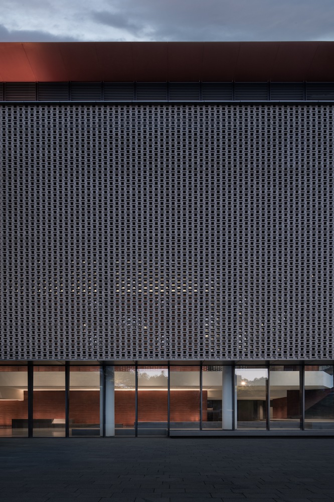 The atrium's permeable brick screen – a monumental "Light Wall" – employs stainless steel tension rods supporting ceramic tile assemblies.