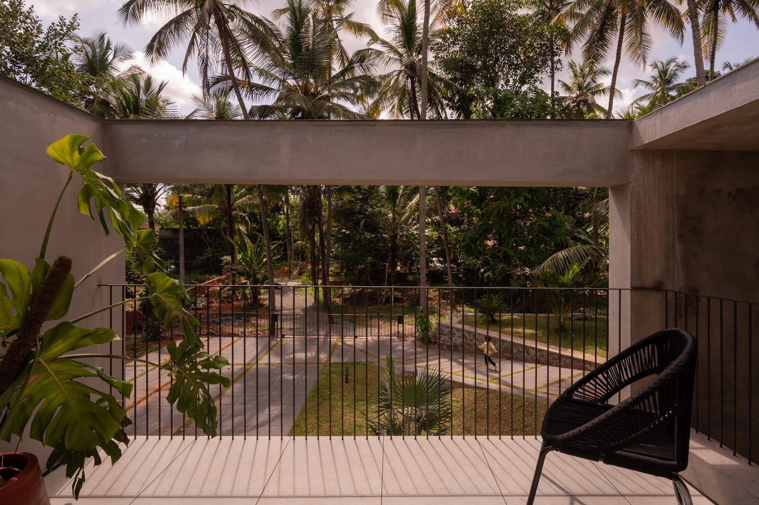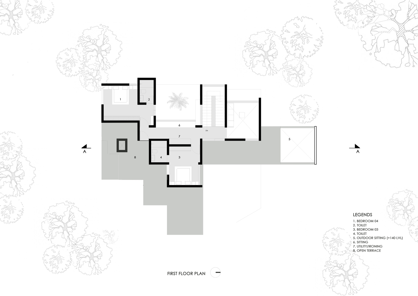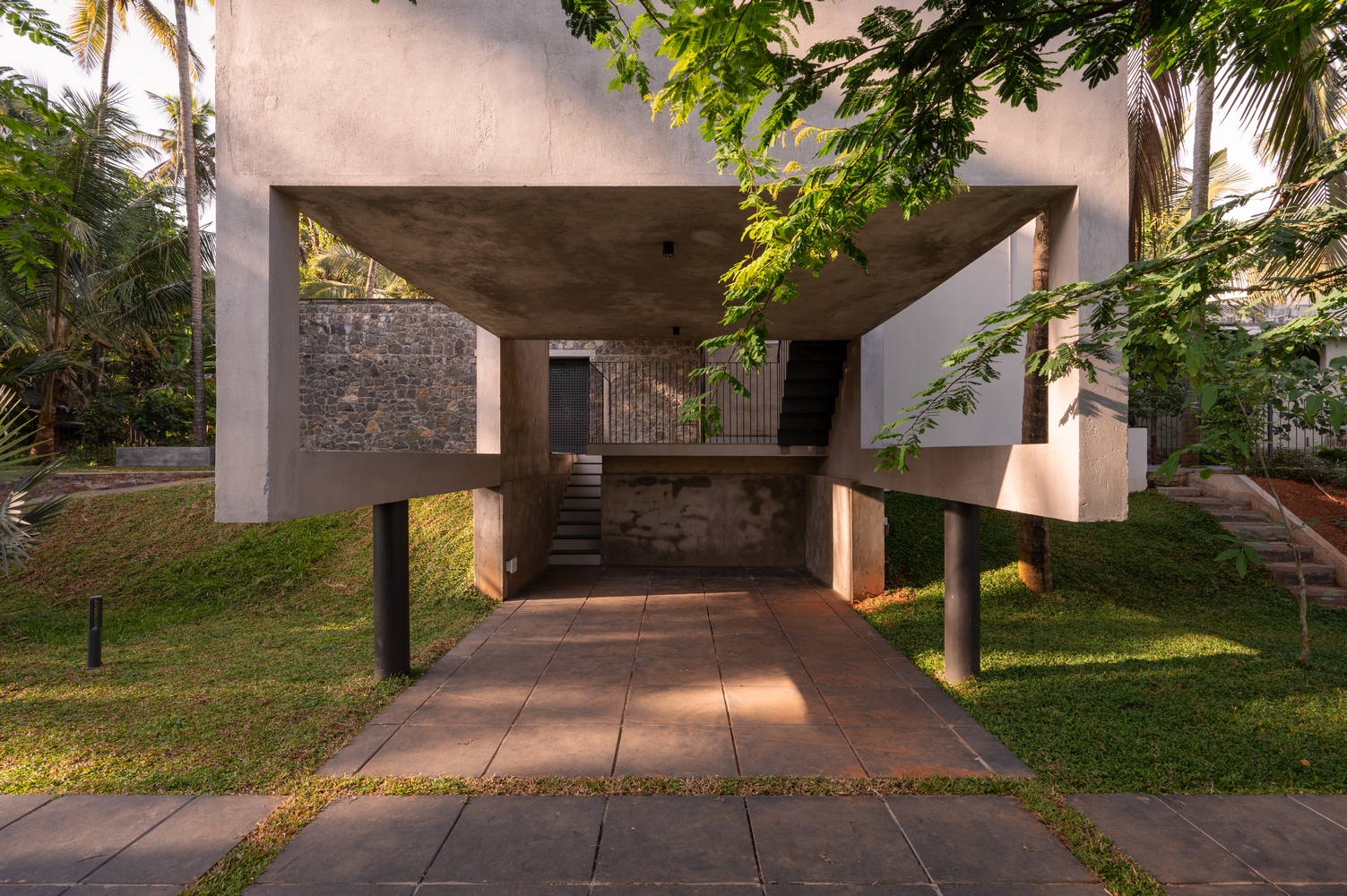 The site has itself got a terrain with a foot level difference within. The zoning was managed to achieve a car parking, a living room, a dining room, four bedrooms with attached toilets and a kitchen, a work space, and a courtyard.