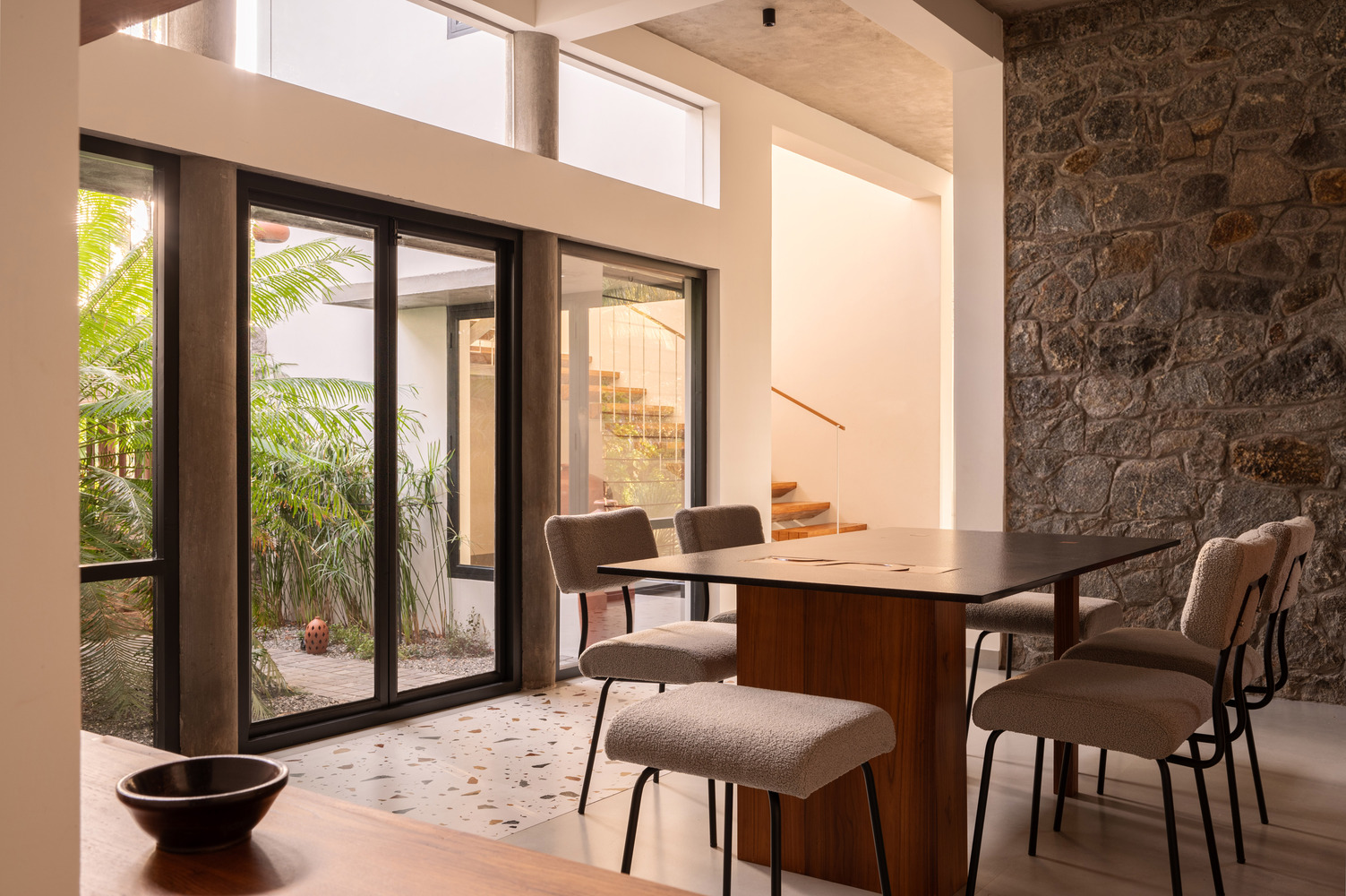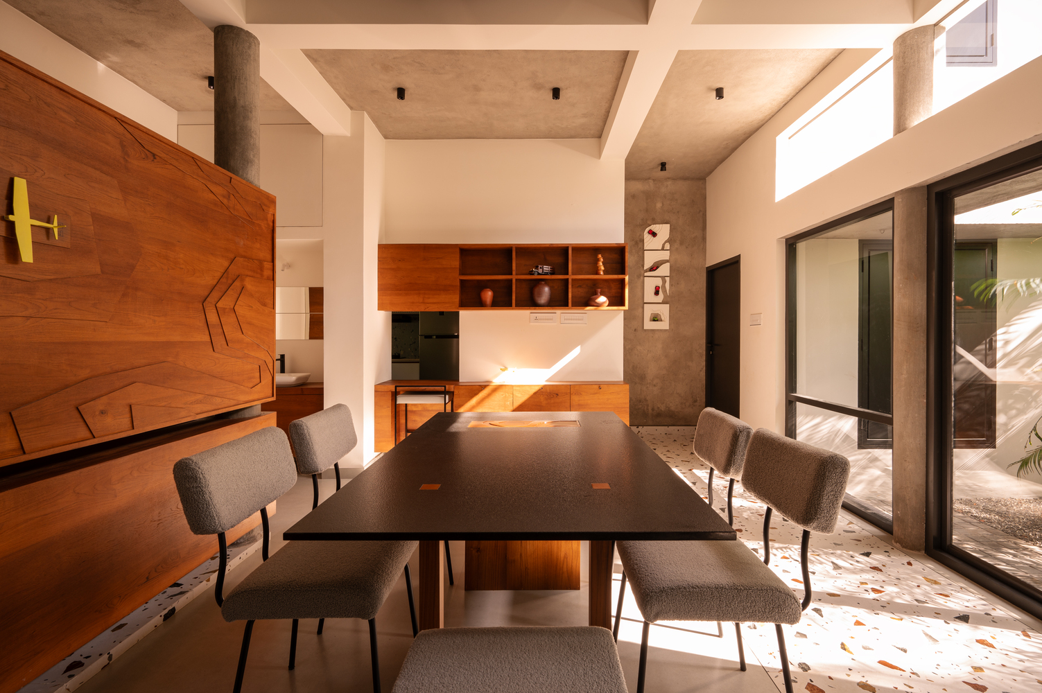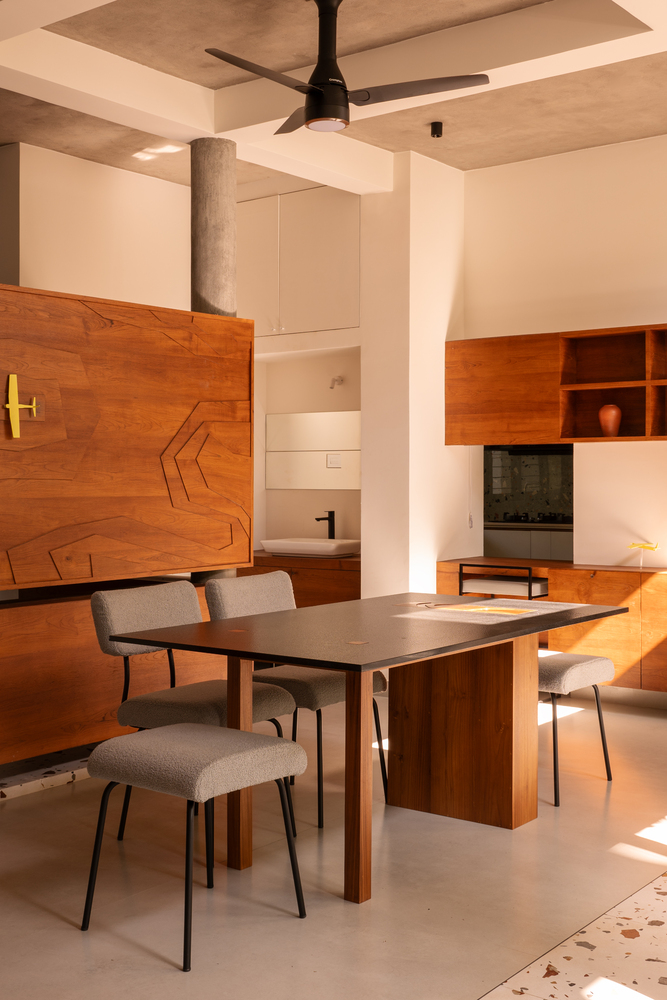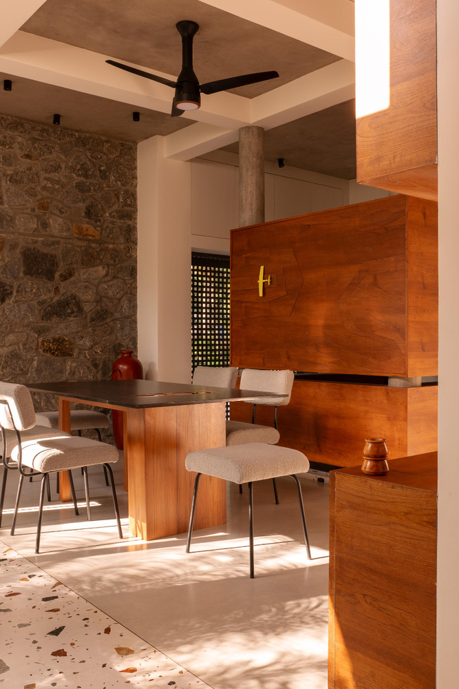 The rough terrain is brought into the interiors through the coffee table, on the partition of the prayer space, and on the dining table.