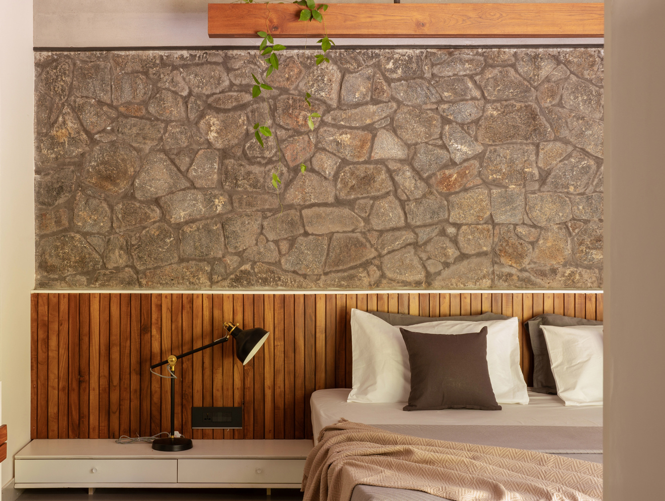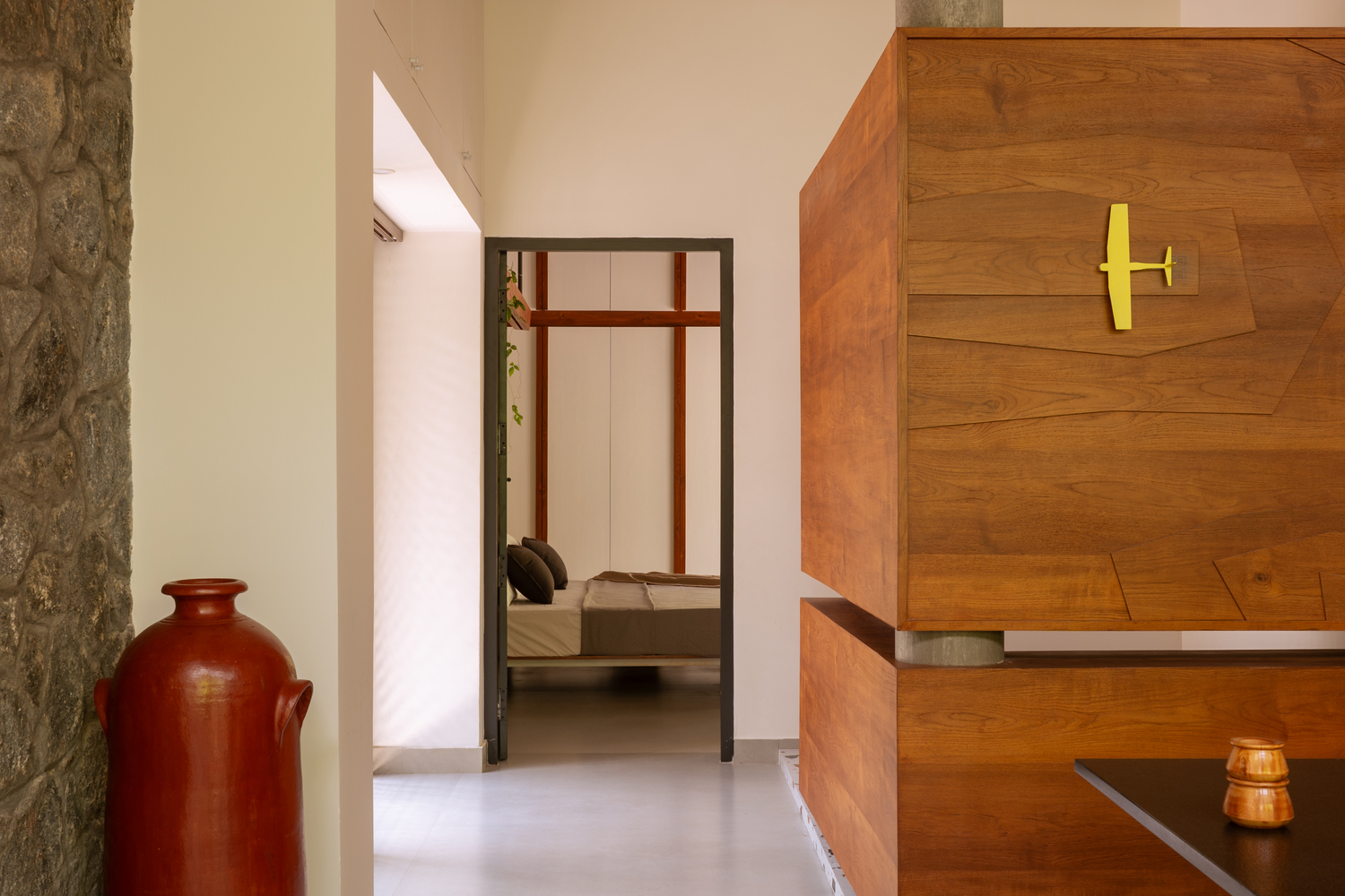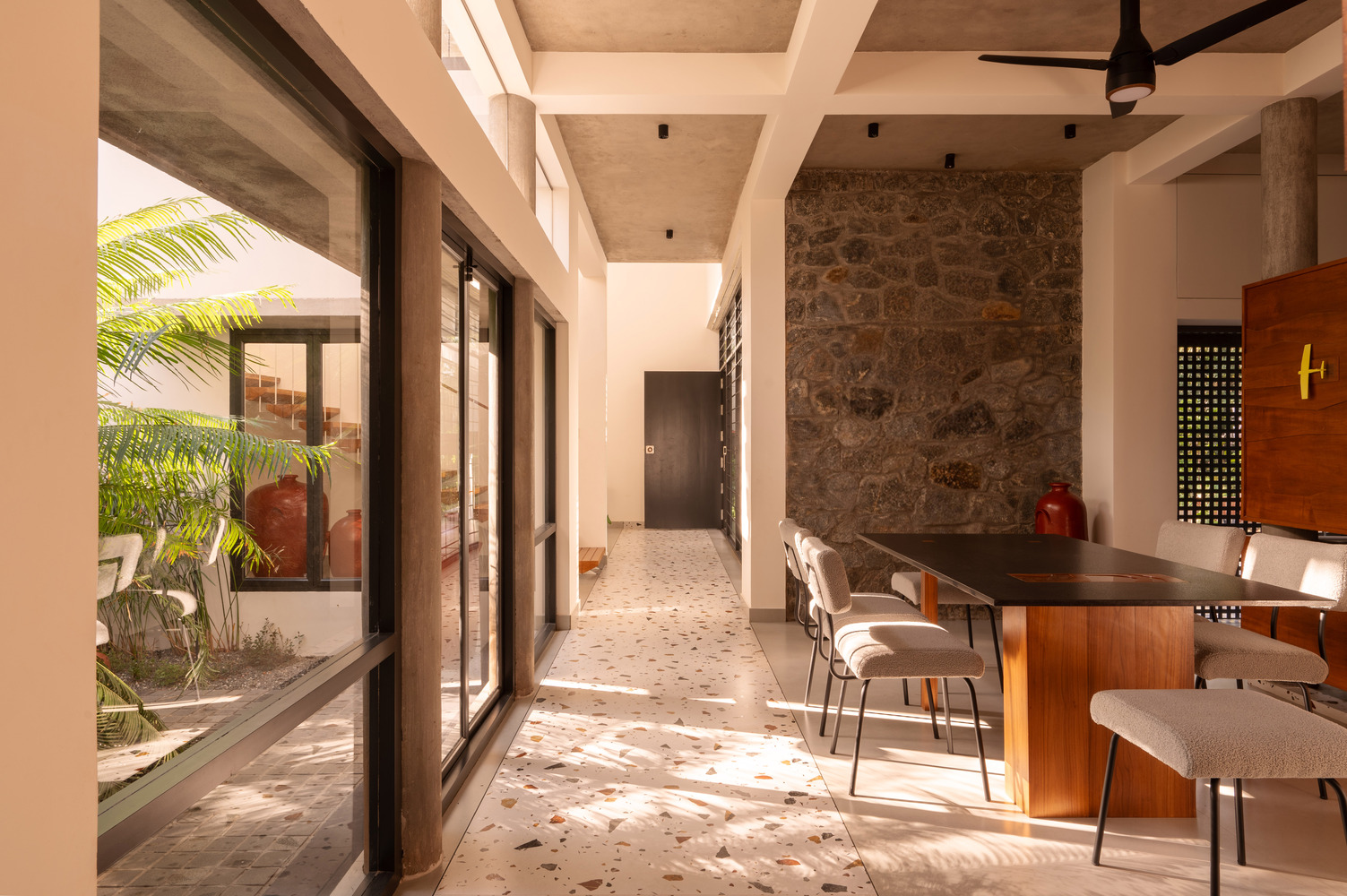 The rough terrain is brought into the interiors through the coffee table, on the partition of the prayer space, and on the dining table.