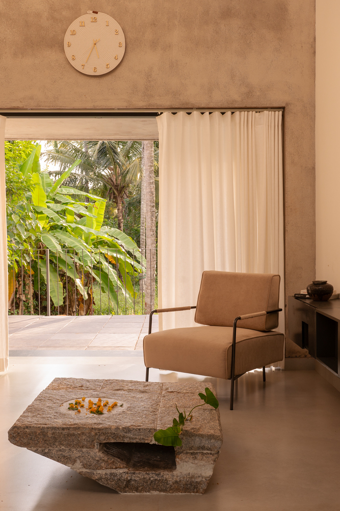 The coffee table in the living room has a fixed position, which is designed from the rubble stones found at the site, giving a rough texture palette to the smooth interiors.